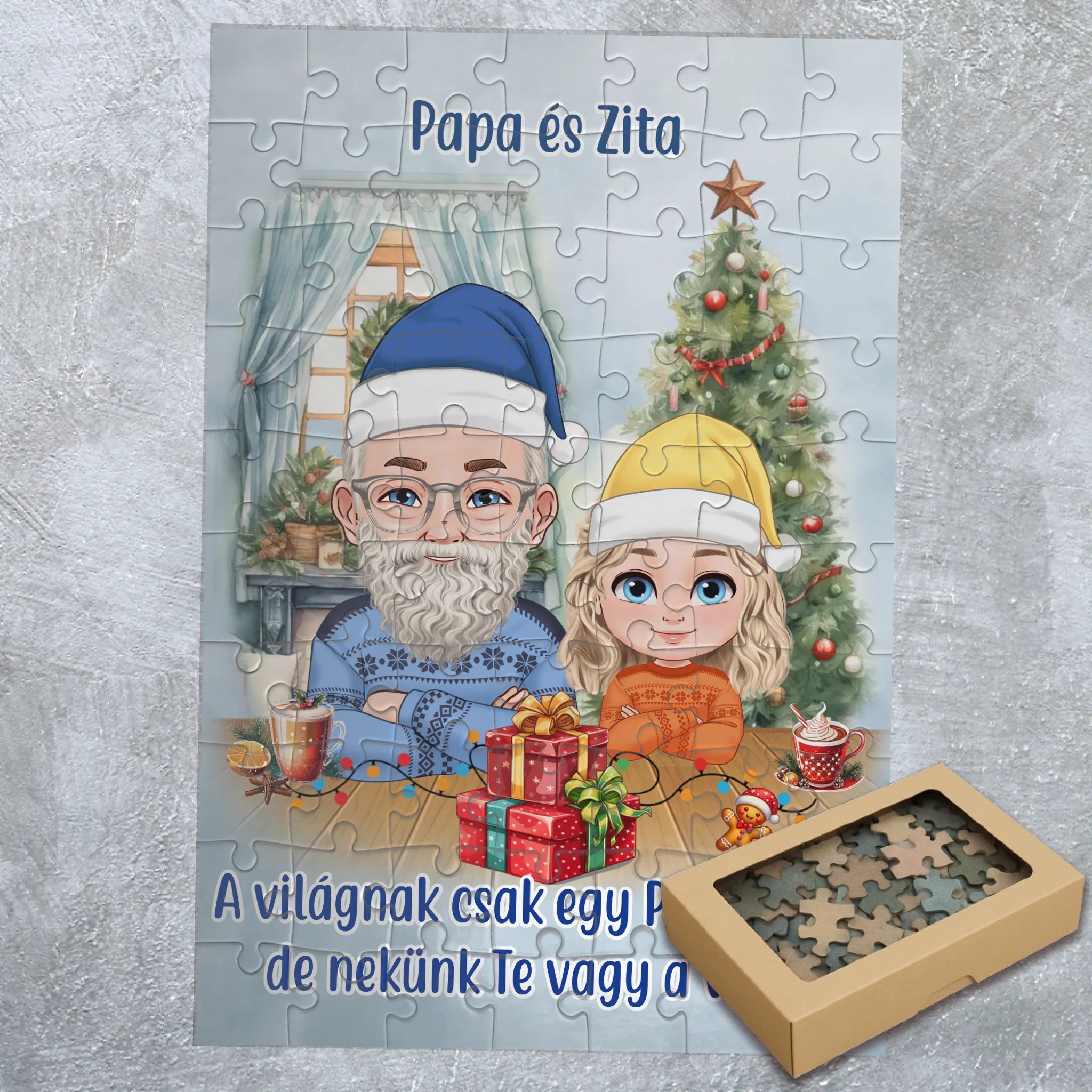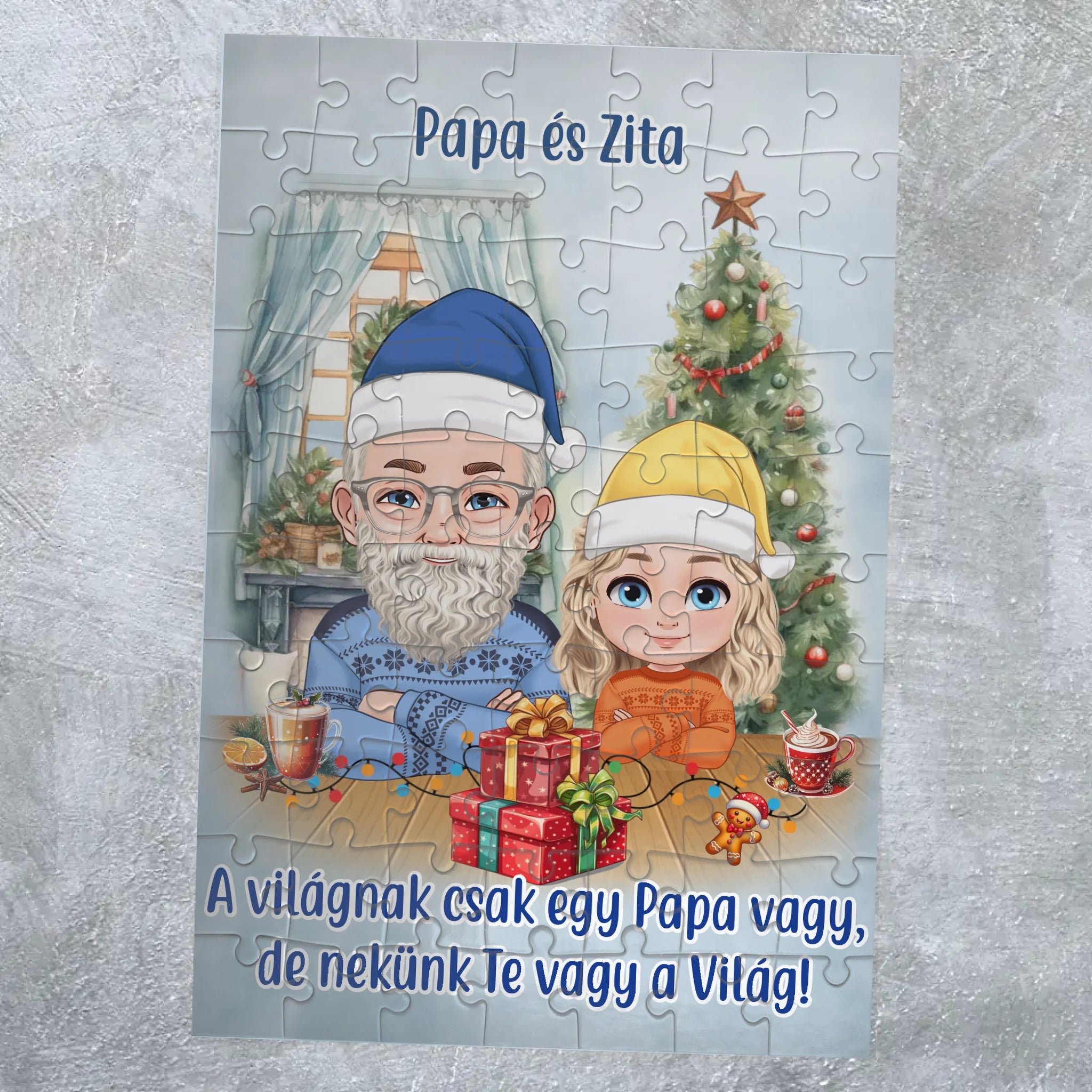 A Papa és unokák karácsonyi puzzle tökéletes választás, ha személyes, megható ajándékot keresel. A választható karakterekkel te alakítod ki a családtagok megjelenését.