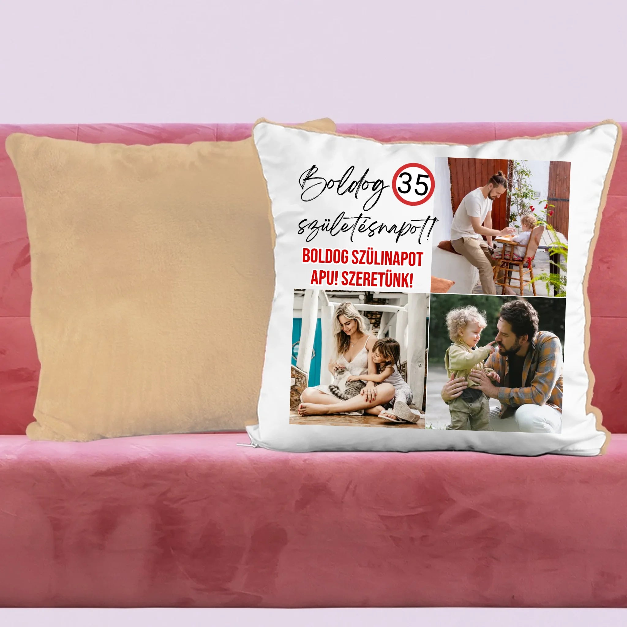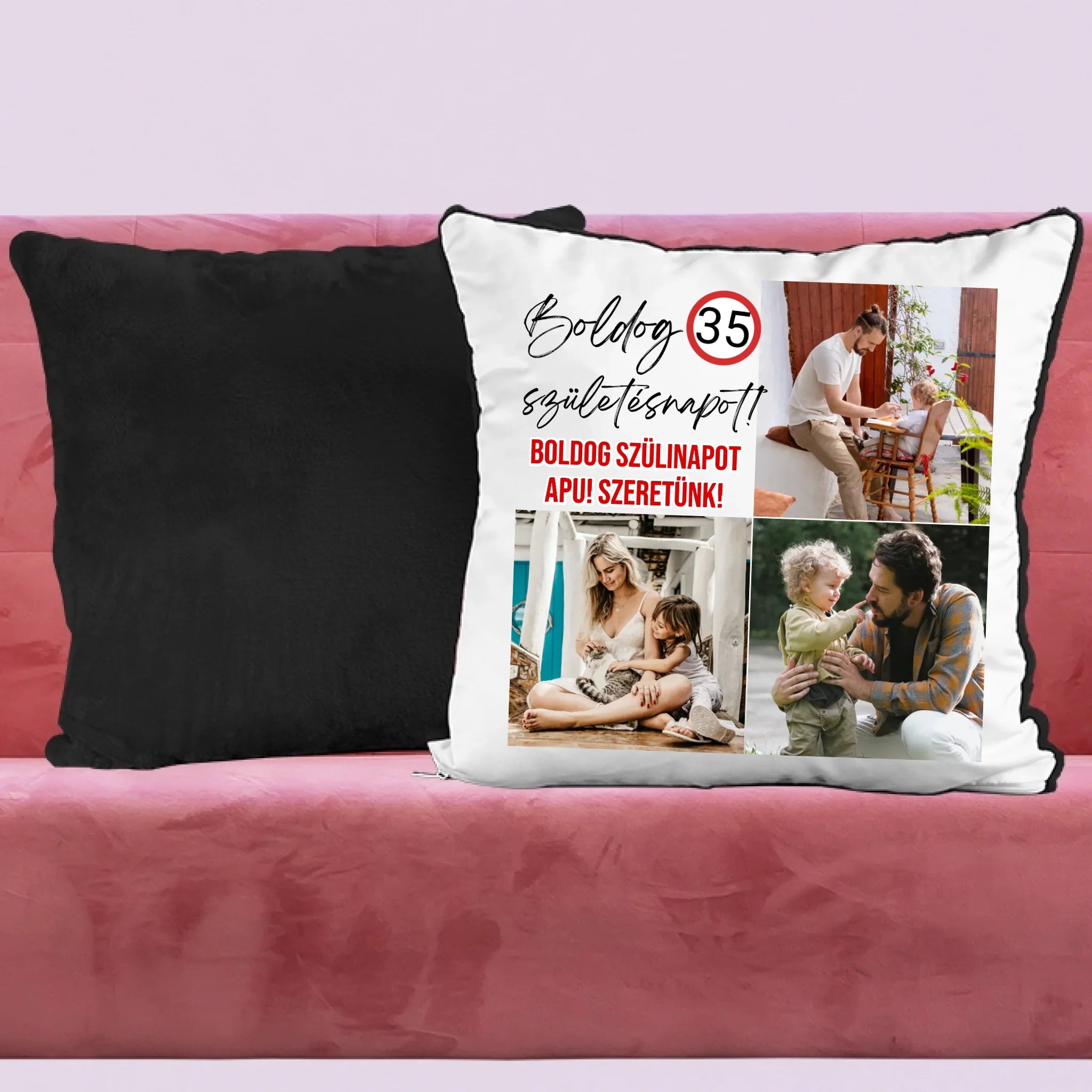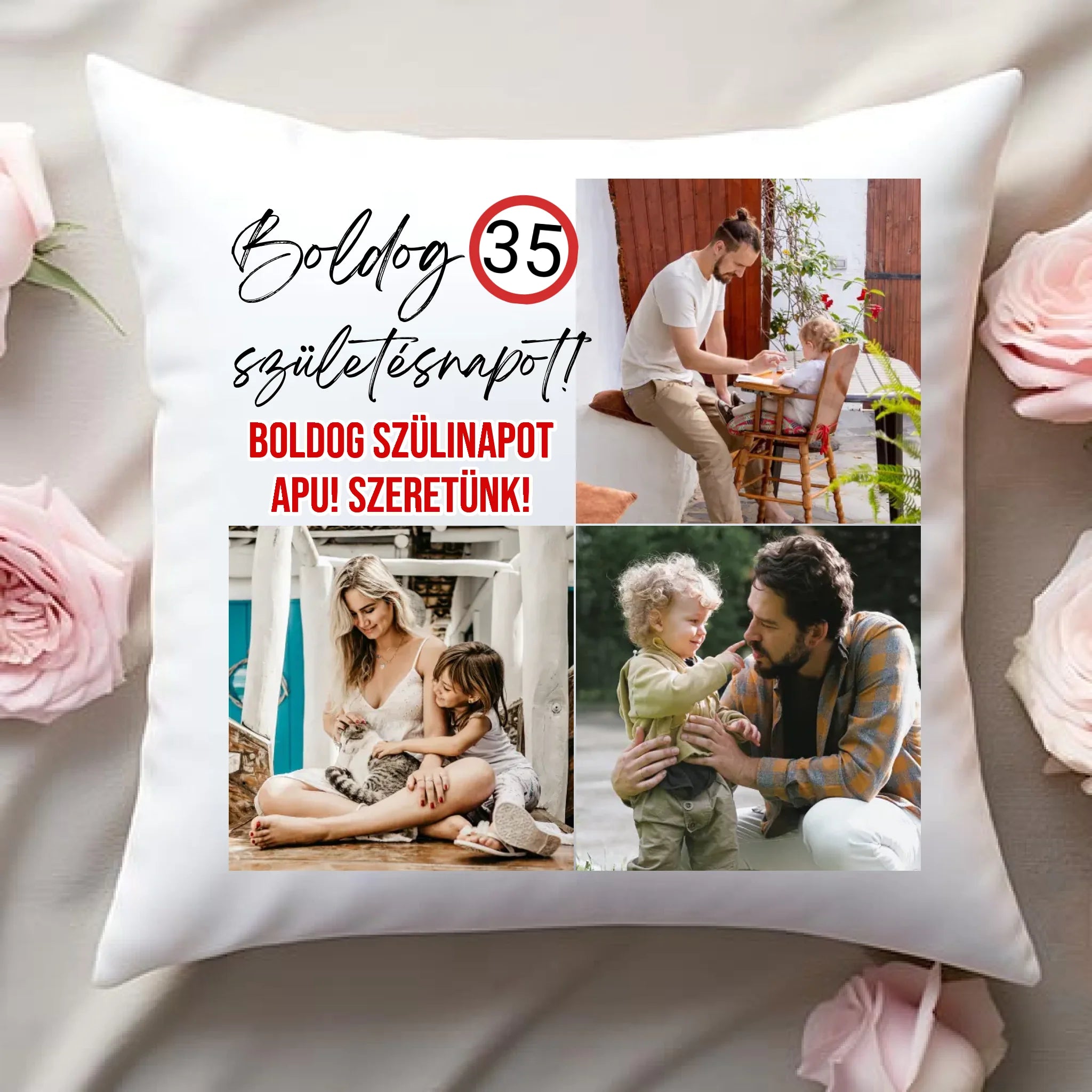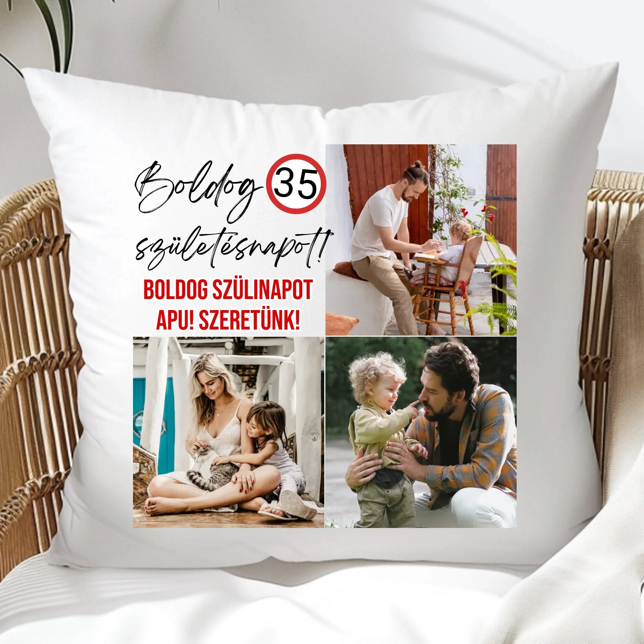 Egyedi fényképes születésnapi párna 3 képpel táblás minta