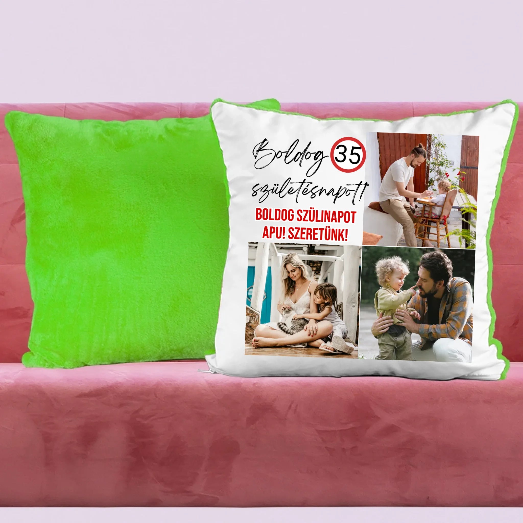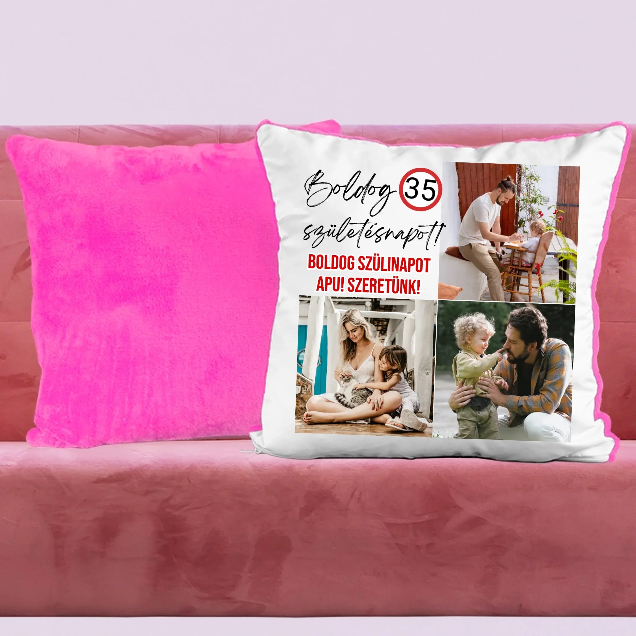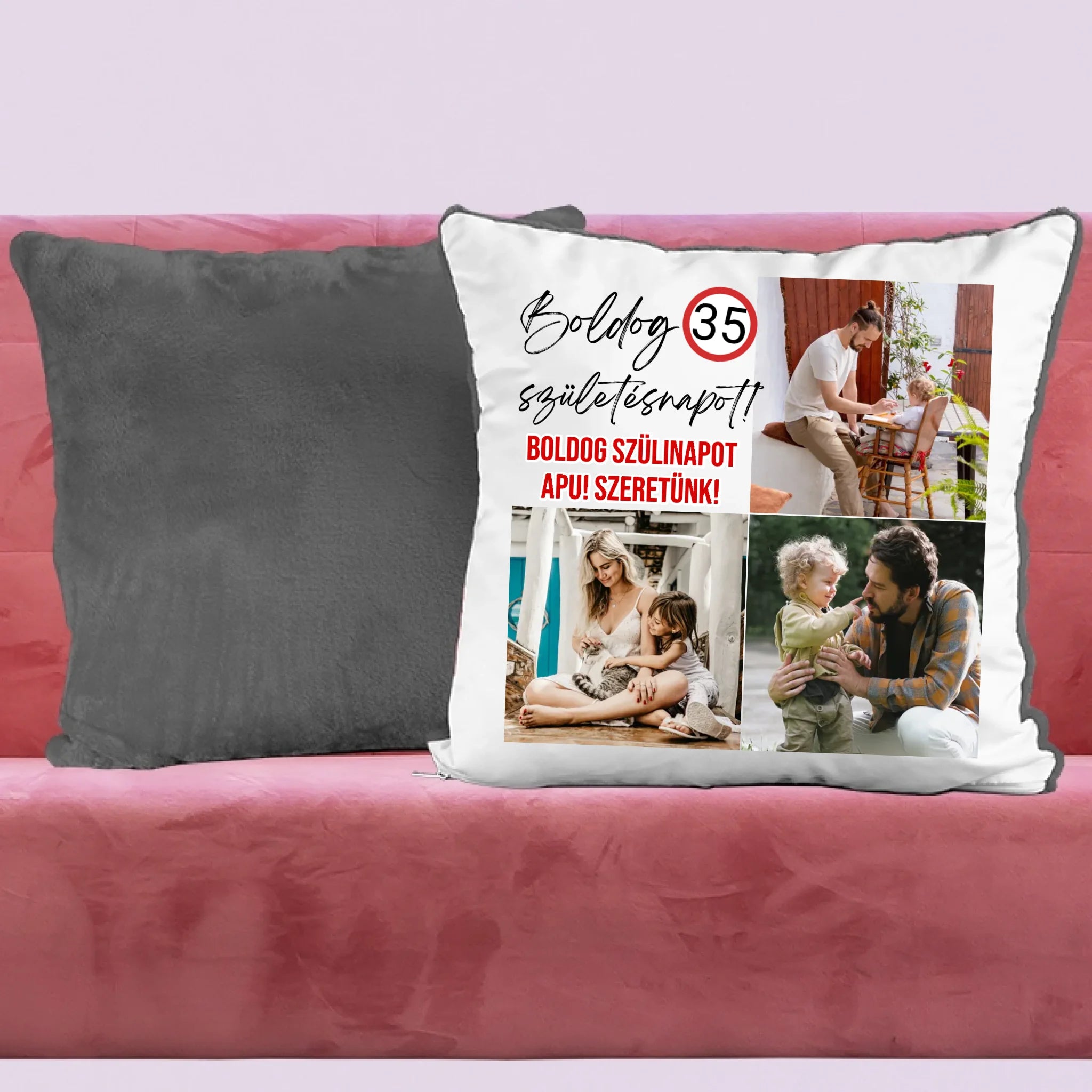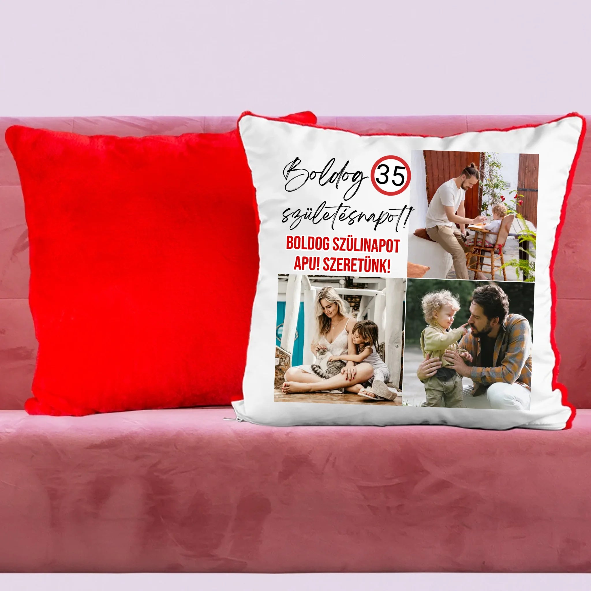 Egyedi fényképes születésnapi párna 3 képpel táblás minta