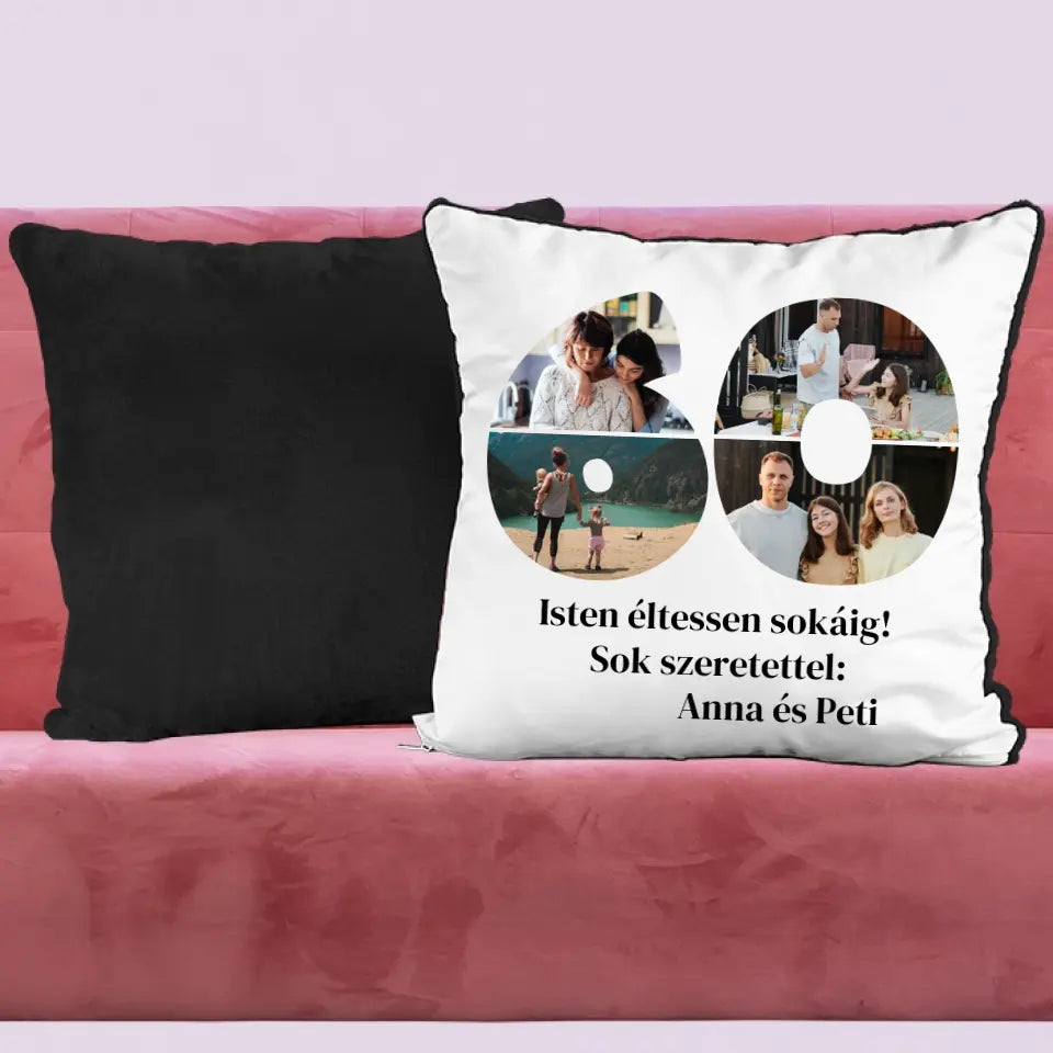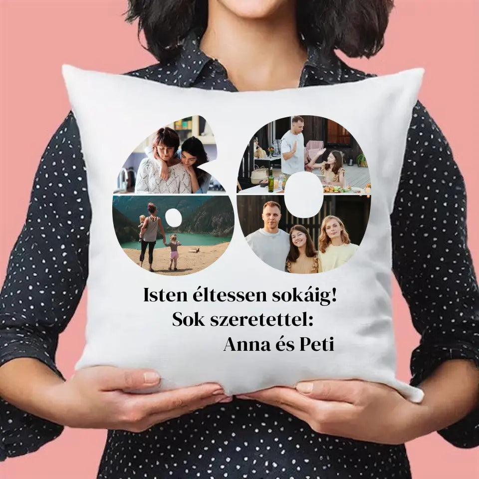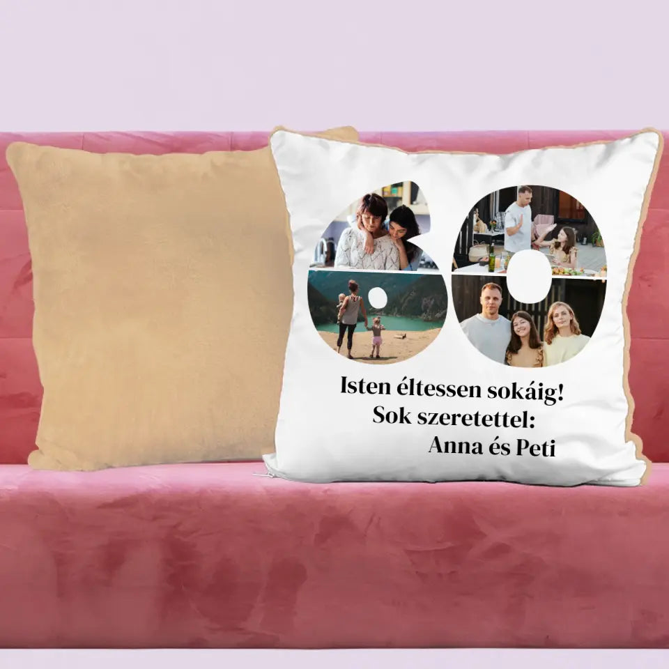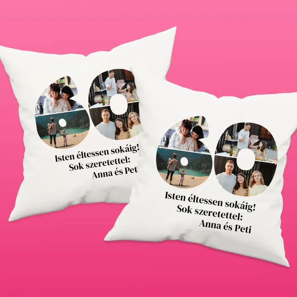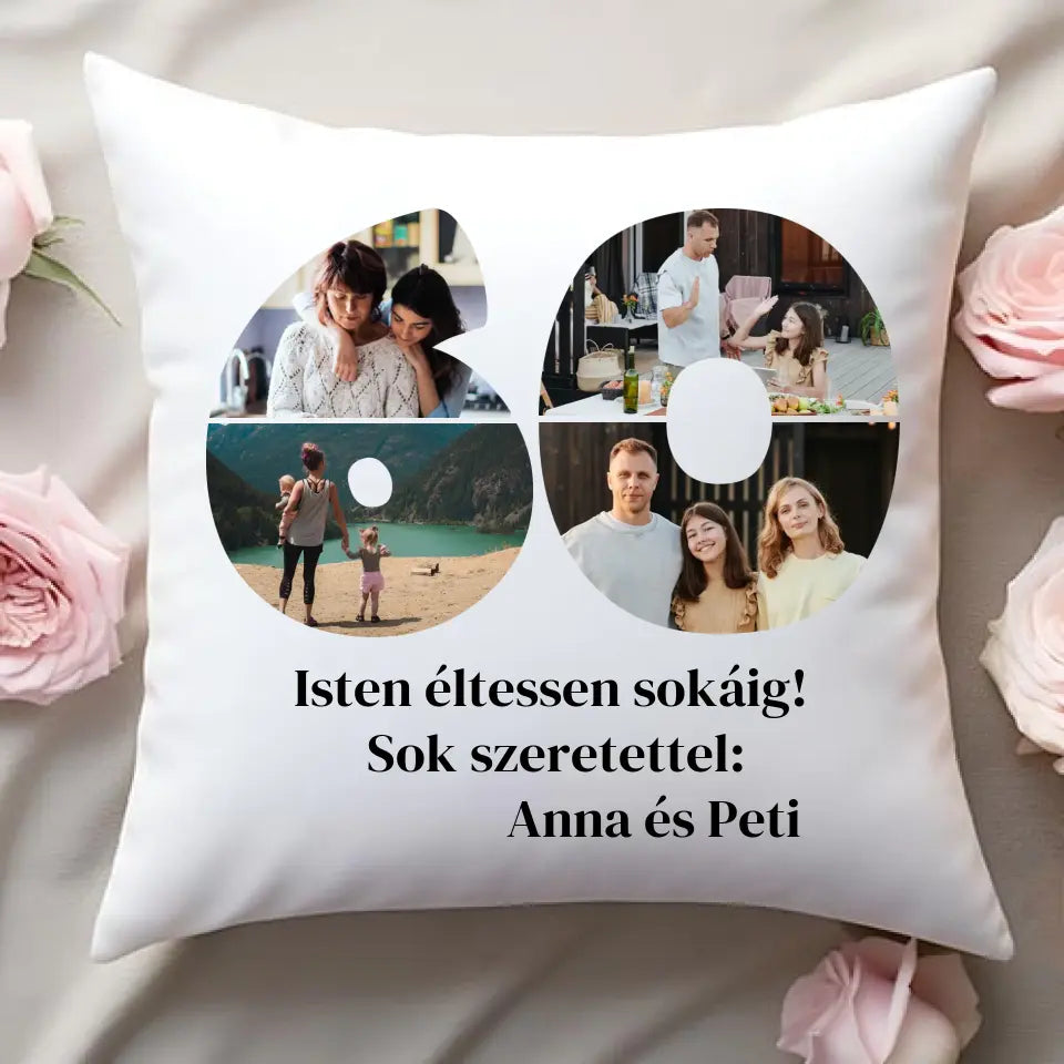 Egyedi fényképes párna szám alakú montázzsal, ami tökéletes ajándék születésnapra vagy évfordulóra is.
