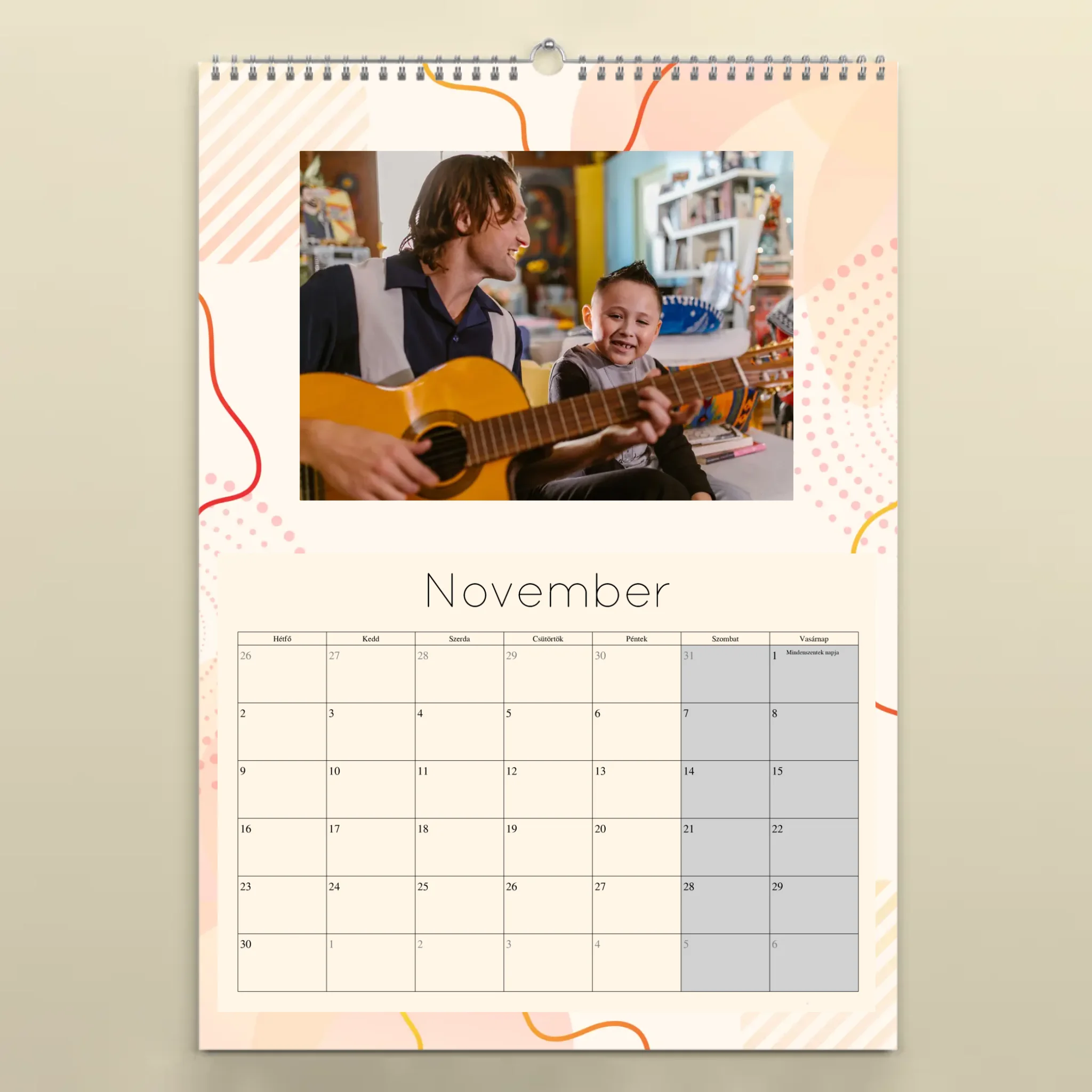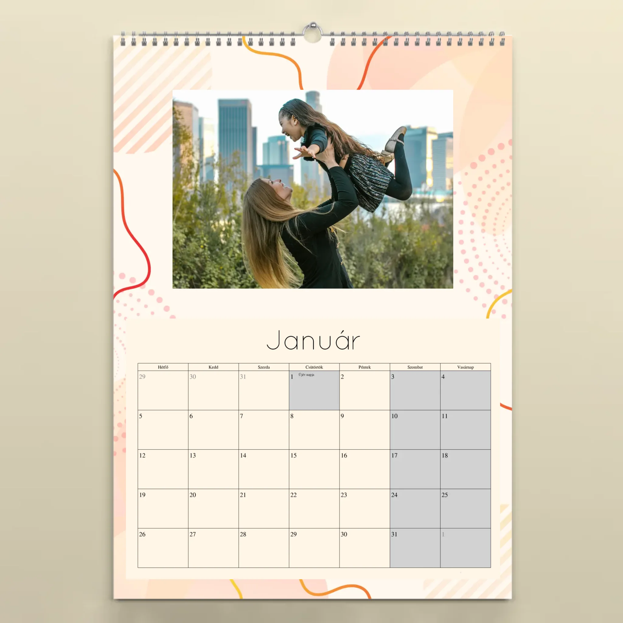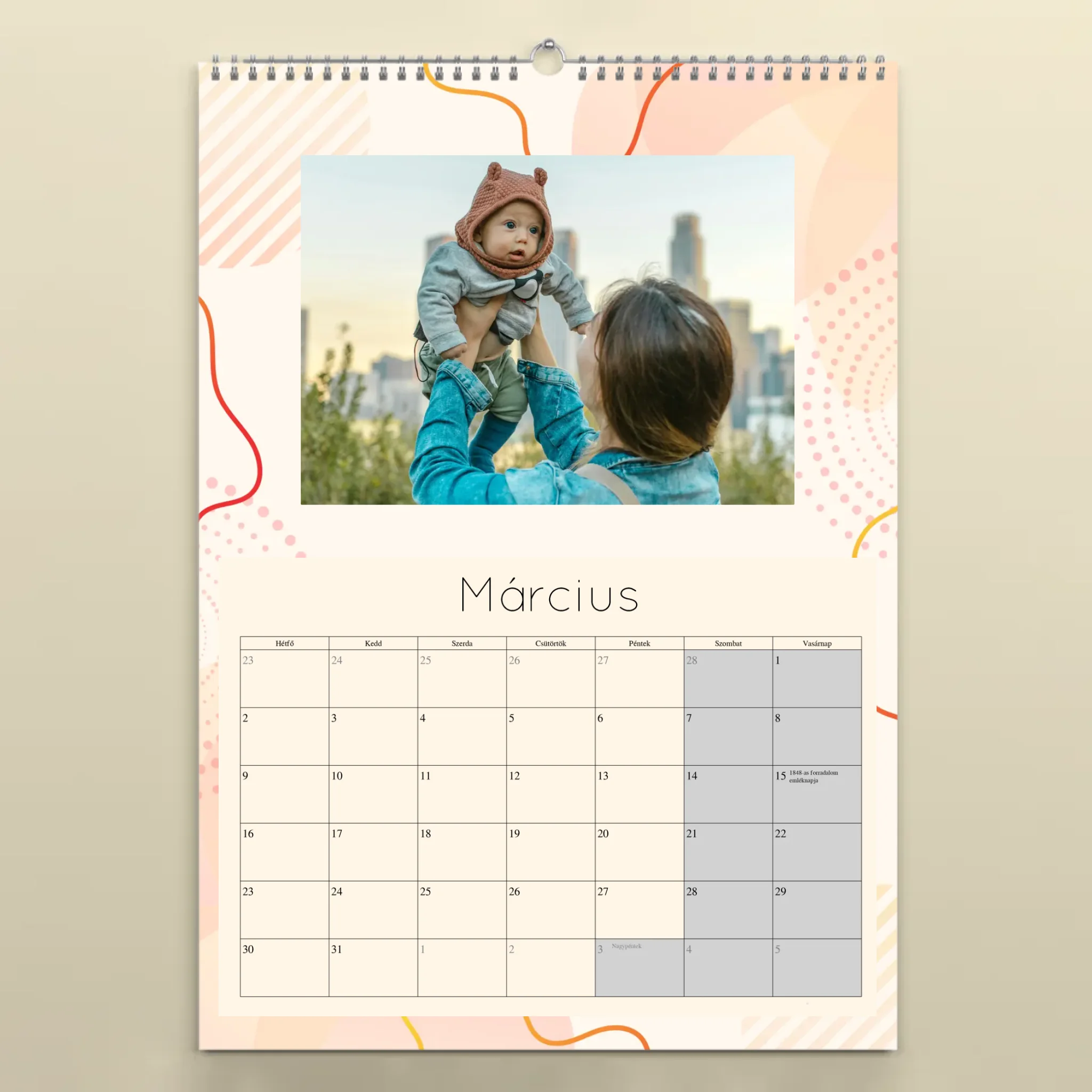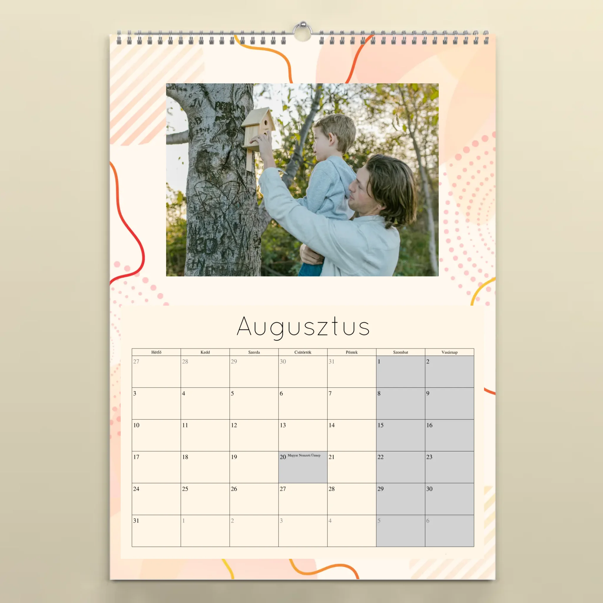 A naptárat könnyedén személyre szabhatod: töltsd fel 12 kedvenc fotódat, válaszd ki a kezdő hónapot, és mi gondoskodunk a prémium minőségű nyomtatásról. A falinaptár minden hónapja tartalmazza a magyar ünnepnapokat, így nemcsak szép, de praktikus kiegészítője is az otthonodnak.