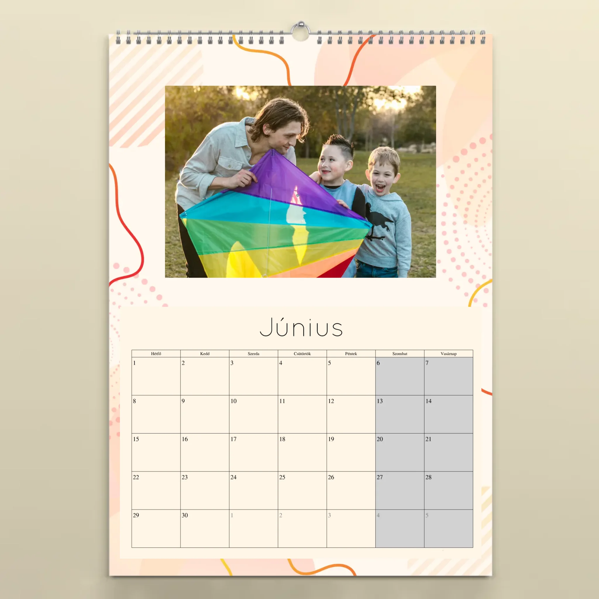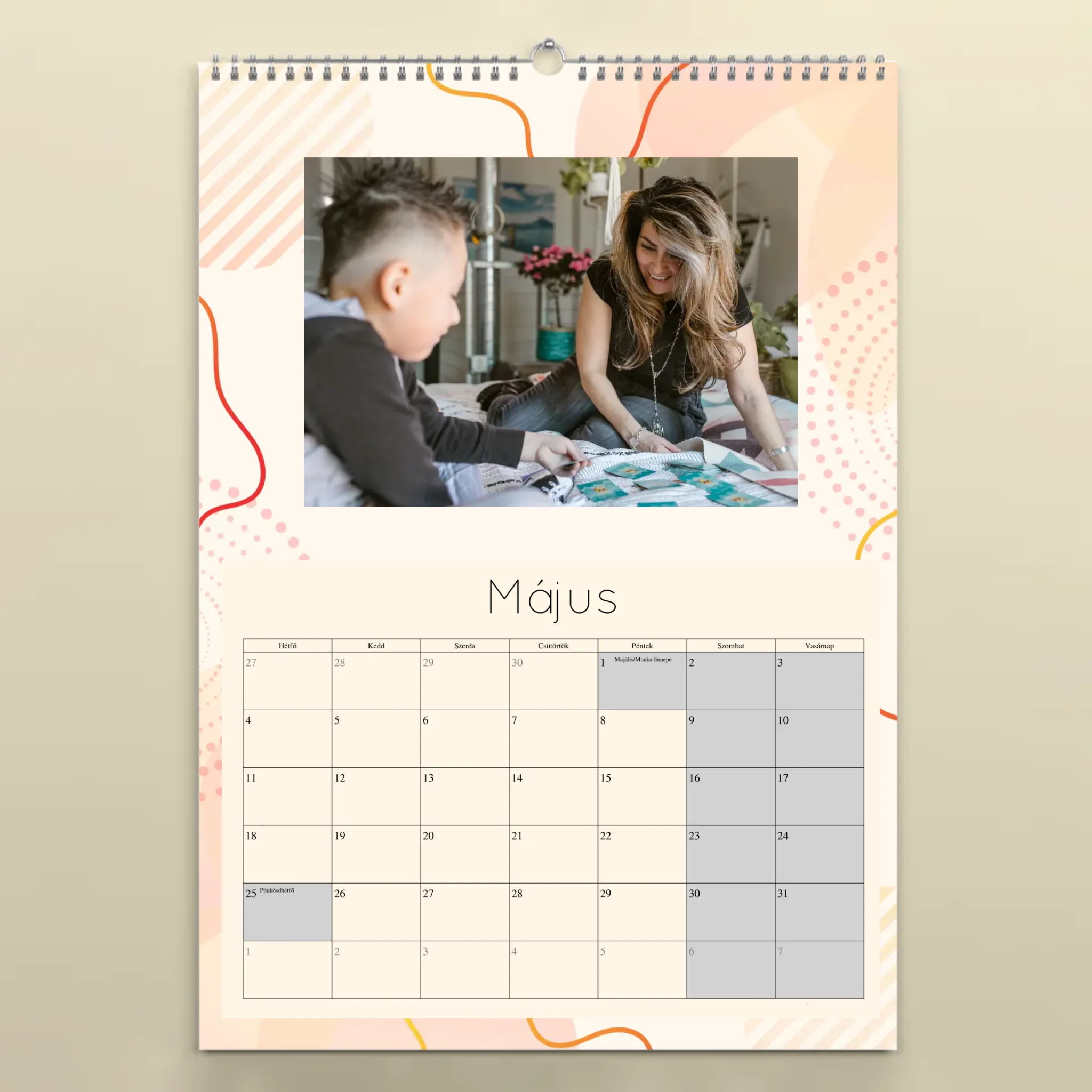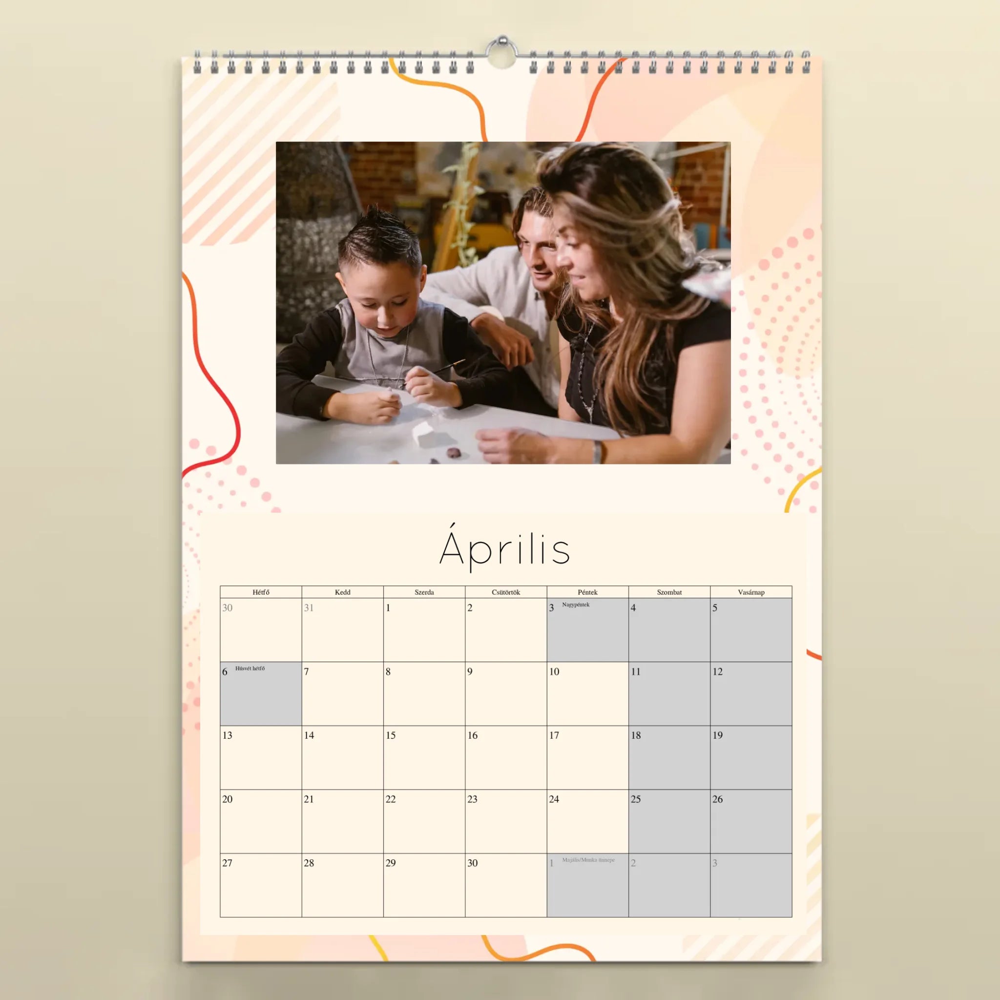 A naptárat könnyedén személyre szabhatod: töltsd fel 12 kedvenc fotódat, válaszd ki a kezdő hónapot, és mi gondoskodunk a prémium minőségű nyomtatásról. A falinaptár minden hónapja tartalmazza a magyar ünnepnapokat, így nemcsak szép, de praktikus kiegészítője is az otthonodnak.