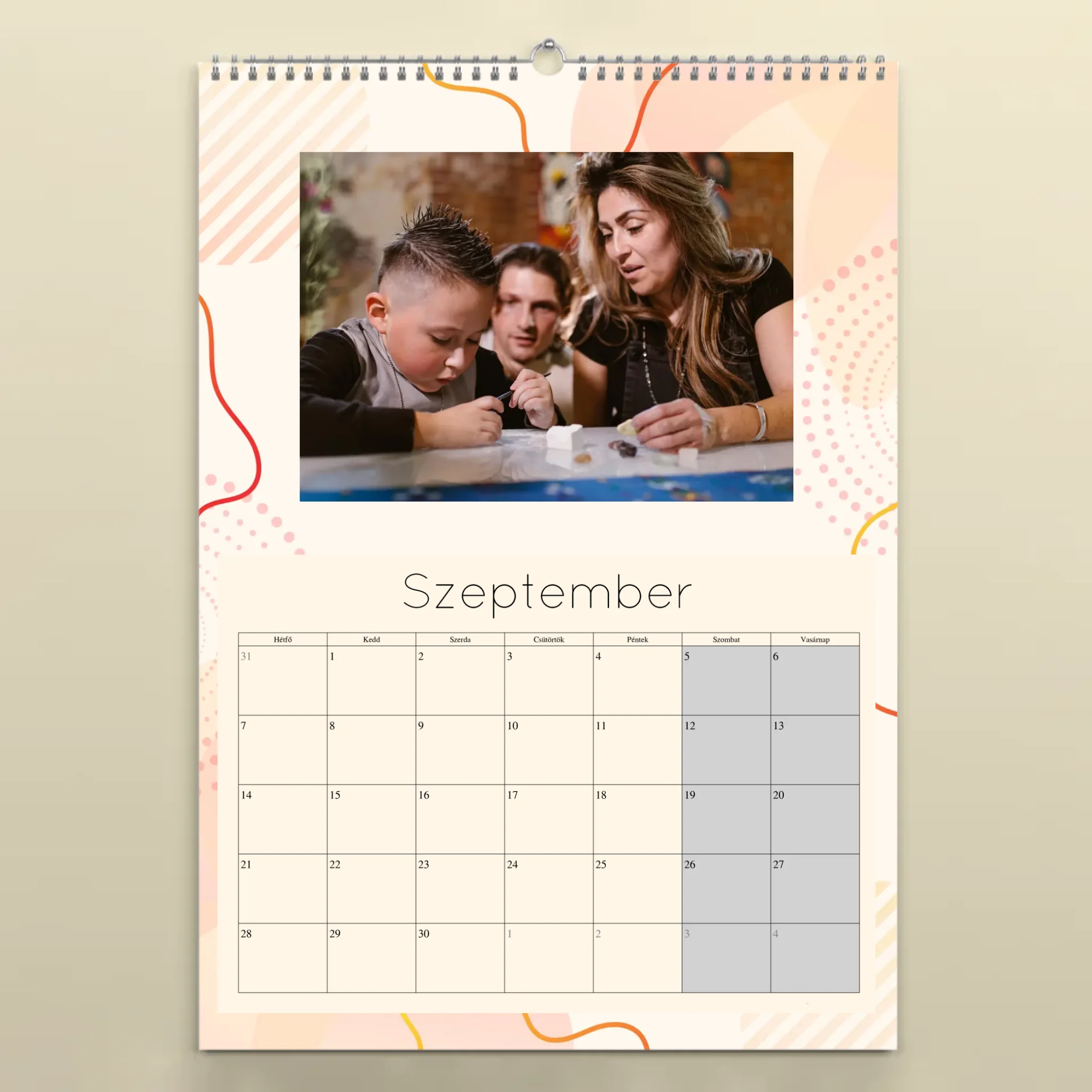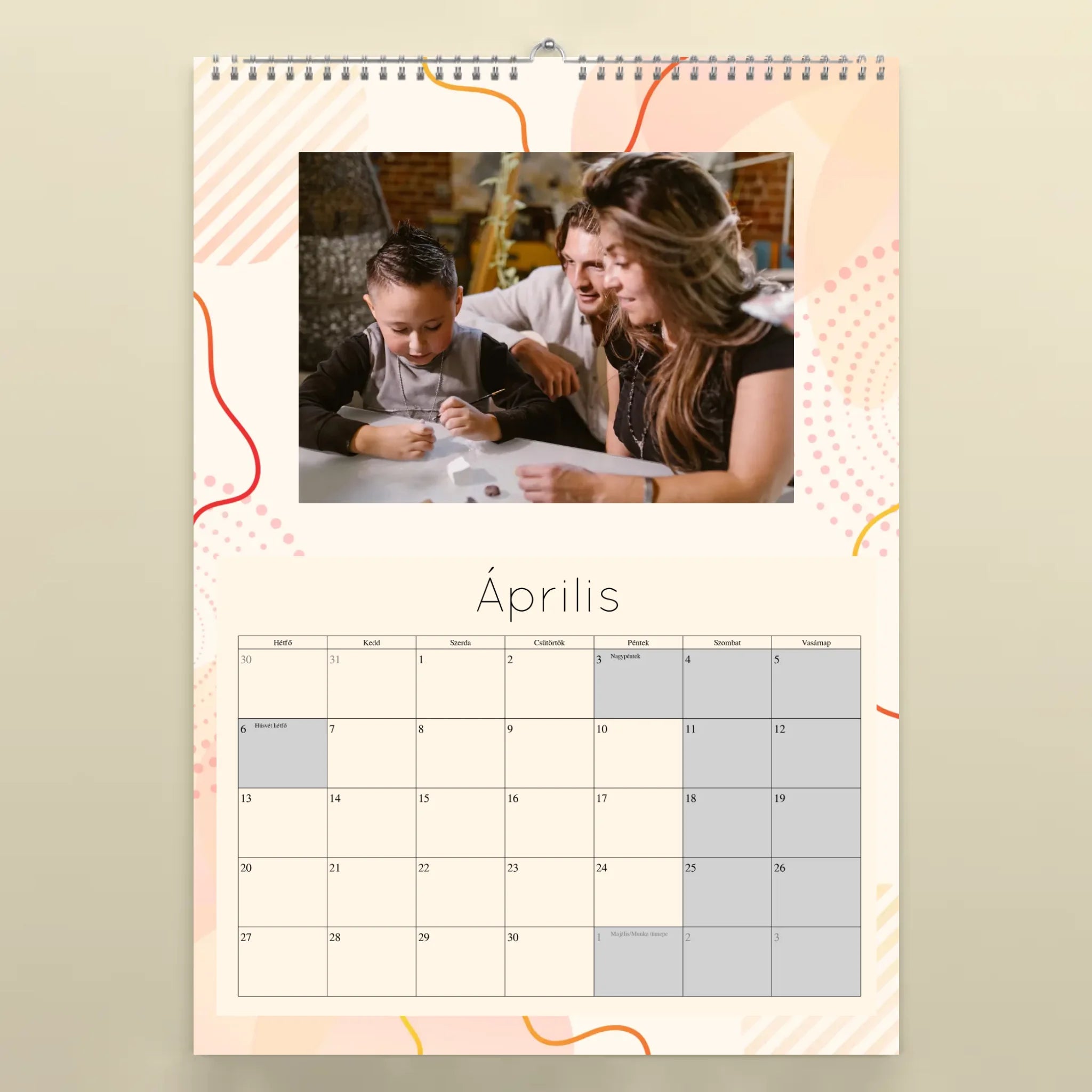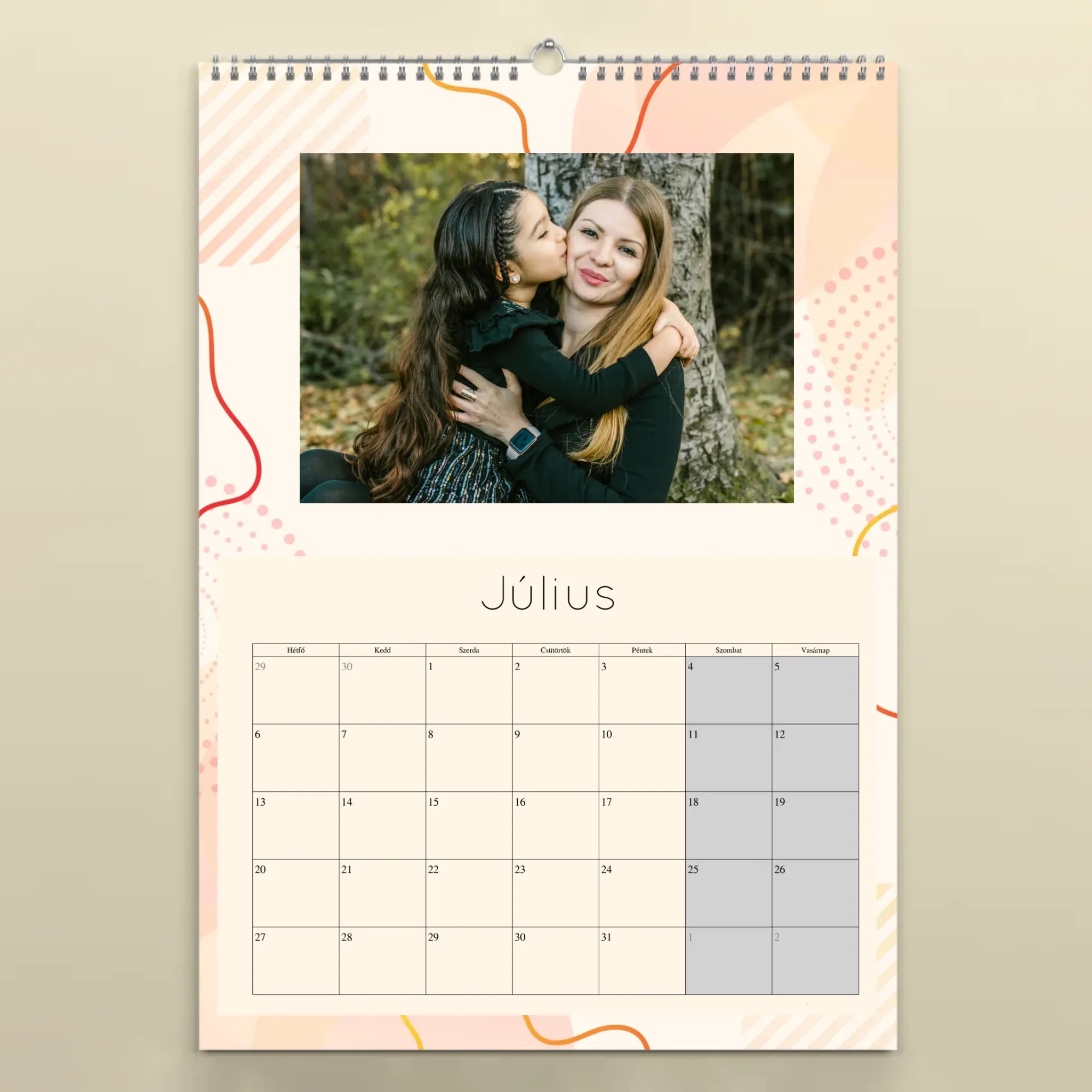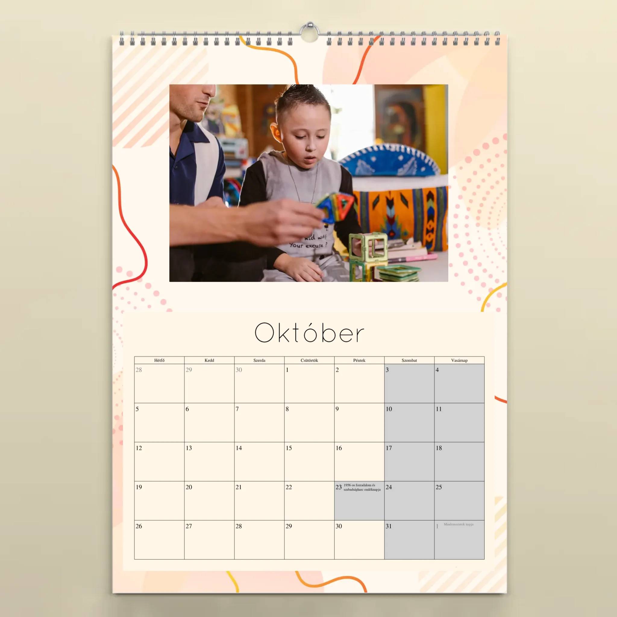 A naptárat könnyedén személyre szabhatod: töltsd fel 12 kedvenc fotódat, válaszd ki a kezdő hónapot, és mi gondoskodunk a prémium minőségű nyomtatásról. A falinaptár minden hónapja tartalmazza a magyar ünnepnapokat, így nemcsak szép, de praktikus kiegészítője is az otthonodnak.