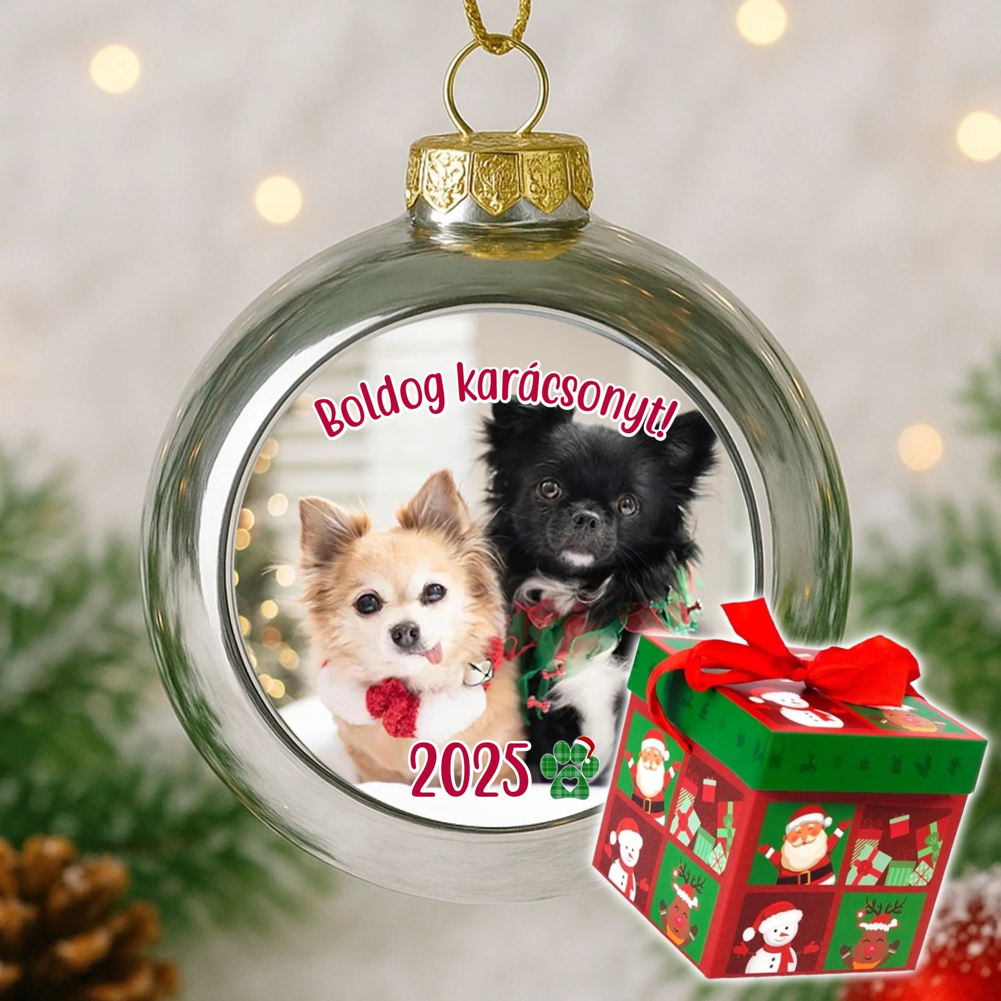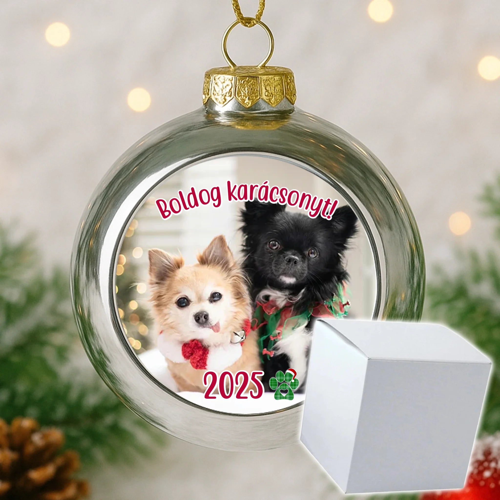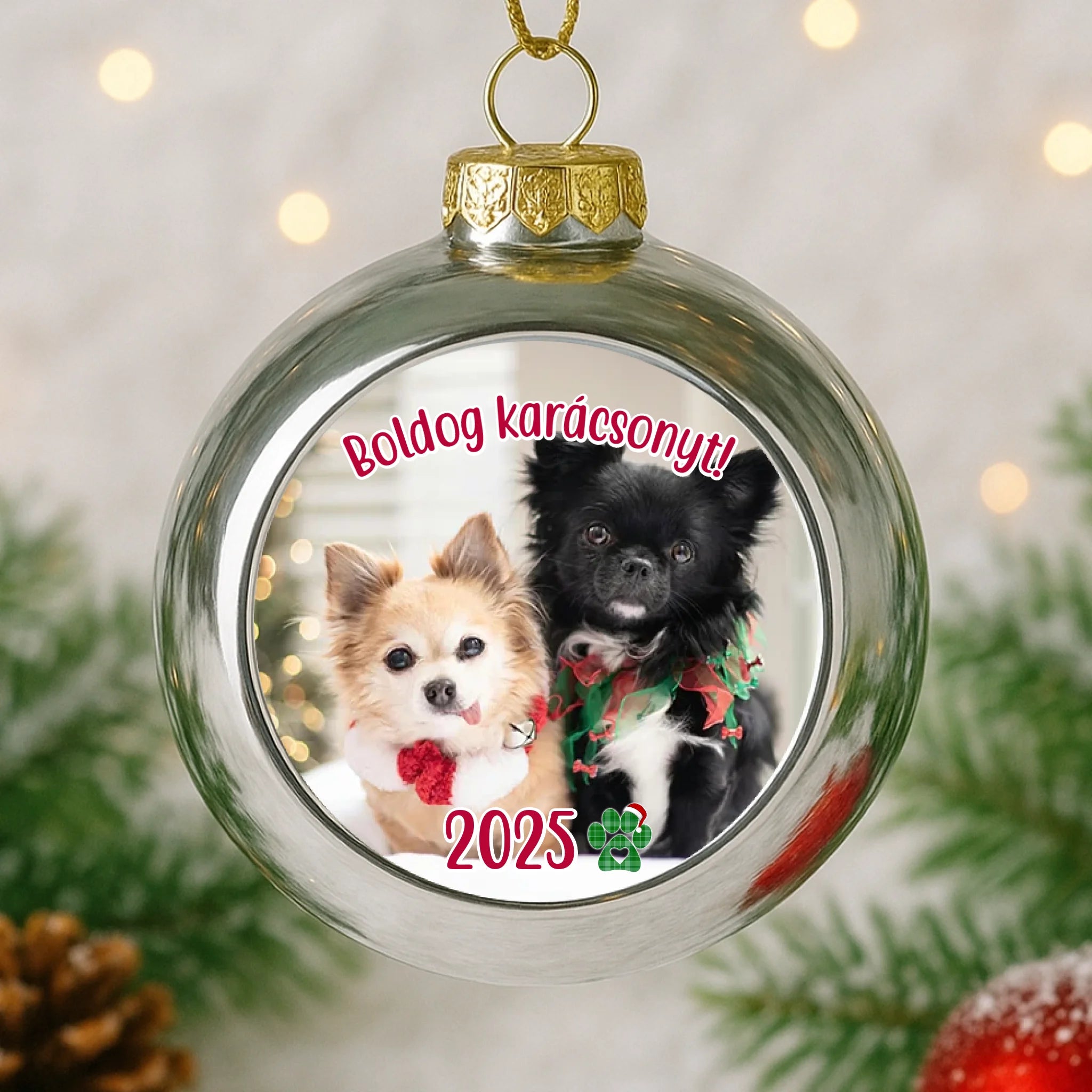 Egyedi képes karácsonyi gömbdísz gazdiknak ezüst színben