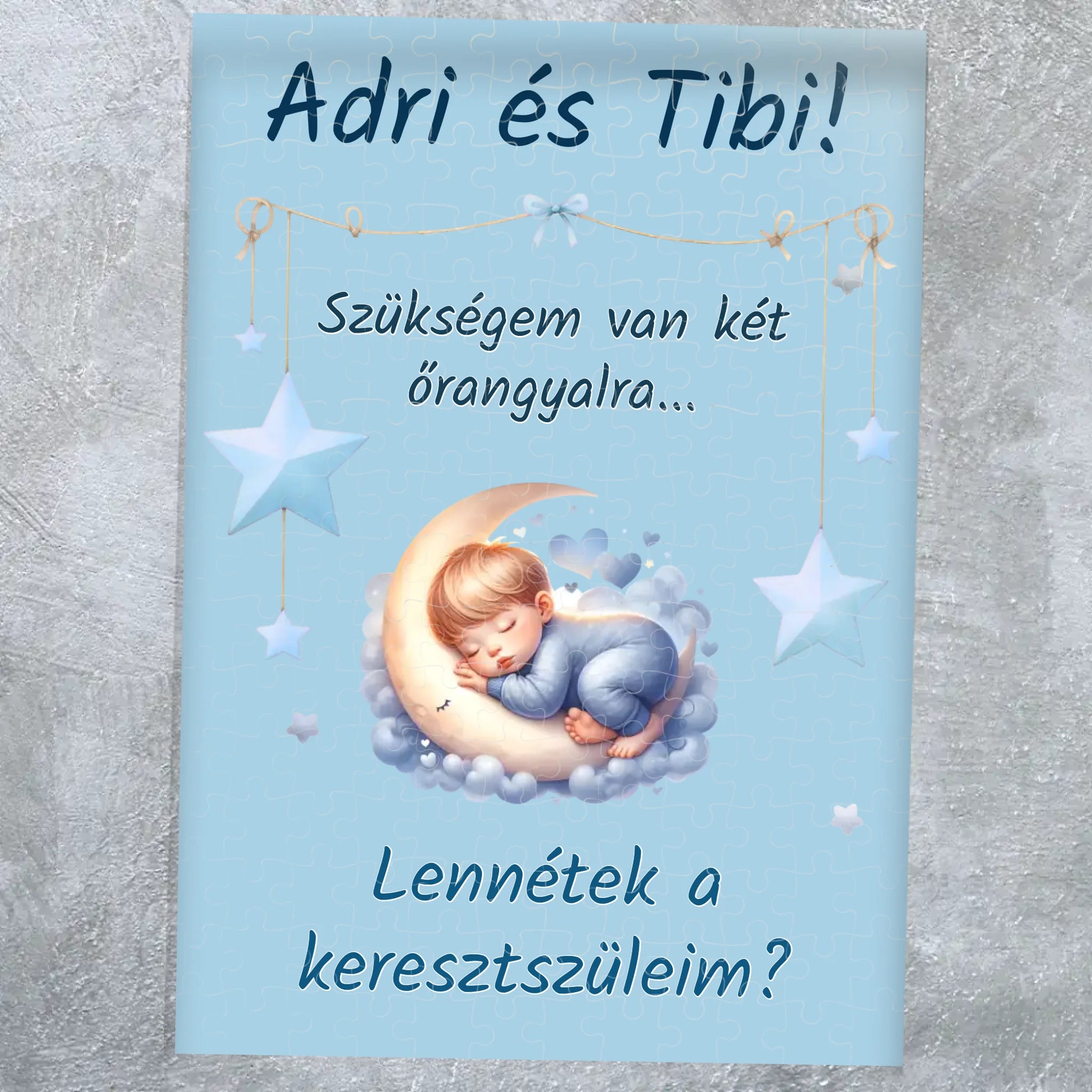 A puzzle darabjait összerakva bontakozik ki a nagy kérdés: „Leszel a keresztszülőm?” Nevekkel és egyedi szöveggel teljesen személyre szabhatod a keresztszülő felkérő ajándékot. A játékos, mégis megható felkérés biztosan könnyeket csal a szemekbe – és örök emlék marad.