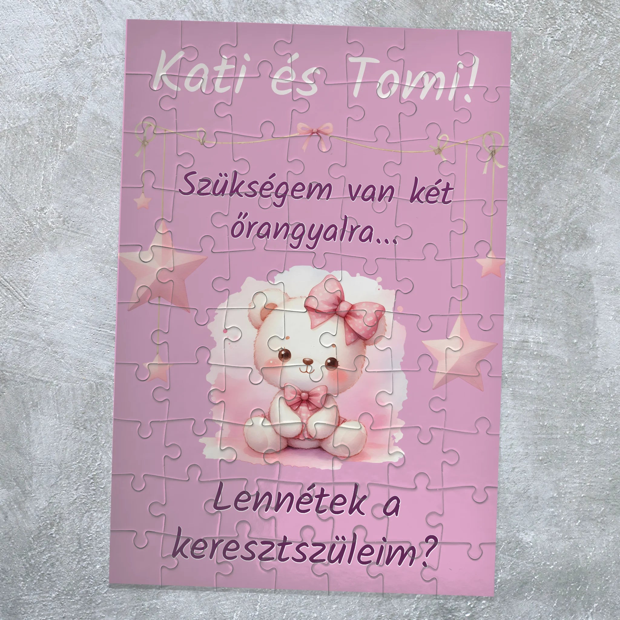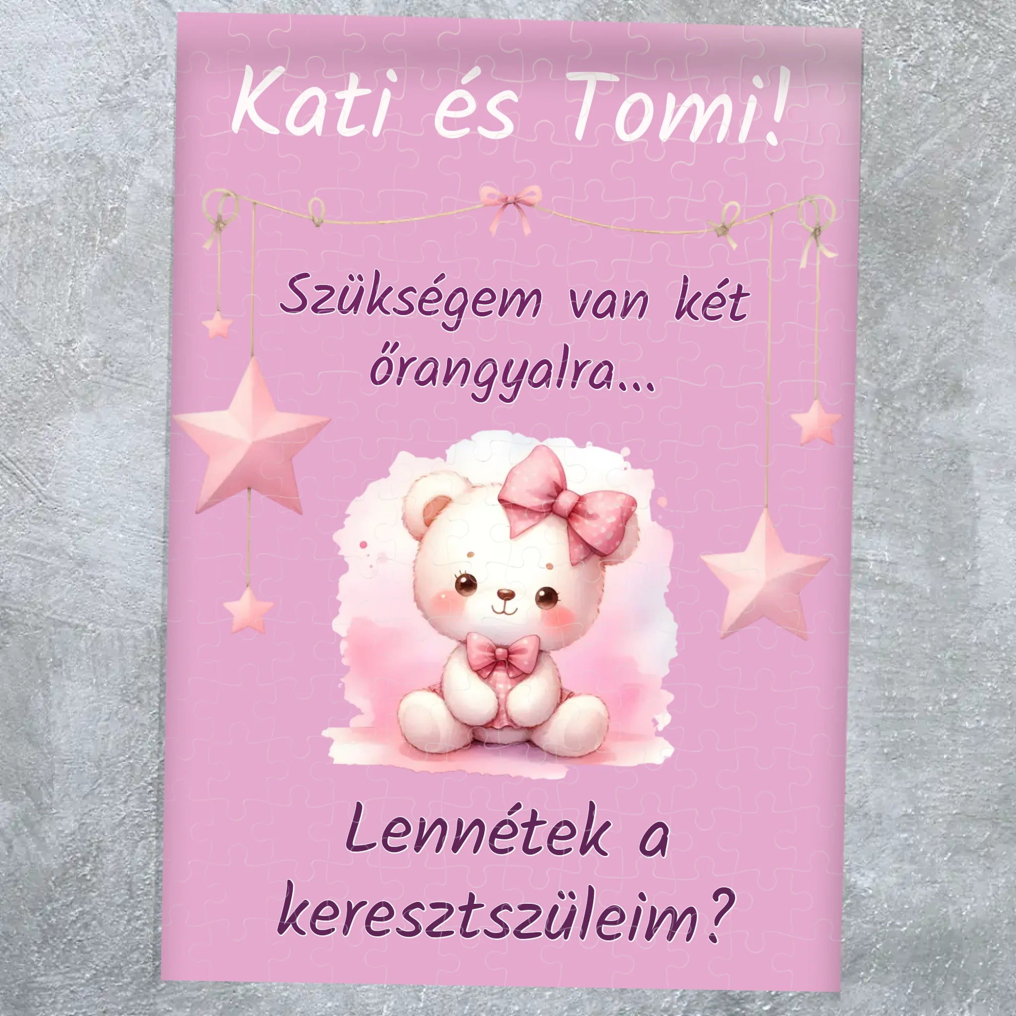 A puzzle darabjait összerakva bontakozik ki a nagy kérdés: „Leszel a keresztszülőm?” Nevekkel és egyedi szöveggel teljesen személyre szabhatod a keresztszülő felkérő ajándékot. A játékos, mégis megható felkérés biztosan könnyeket csal a szemekbe – és örök emlék marad.
