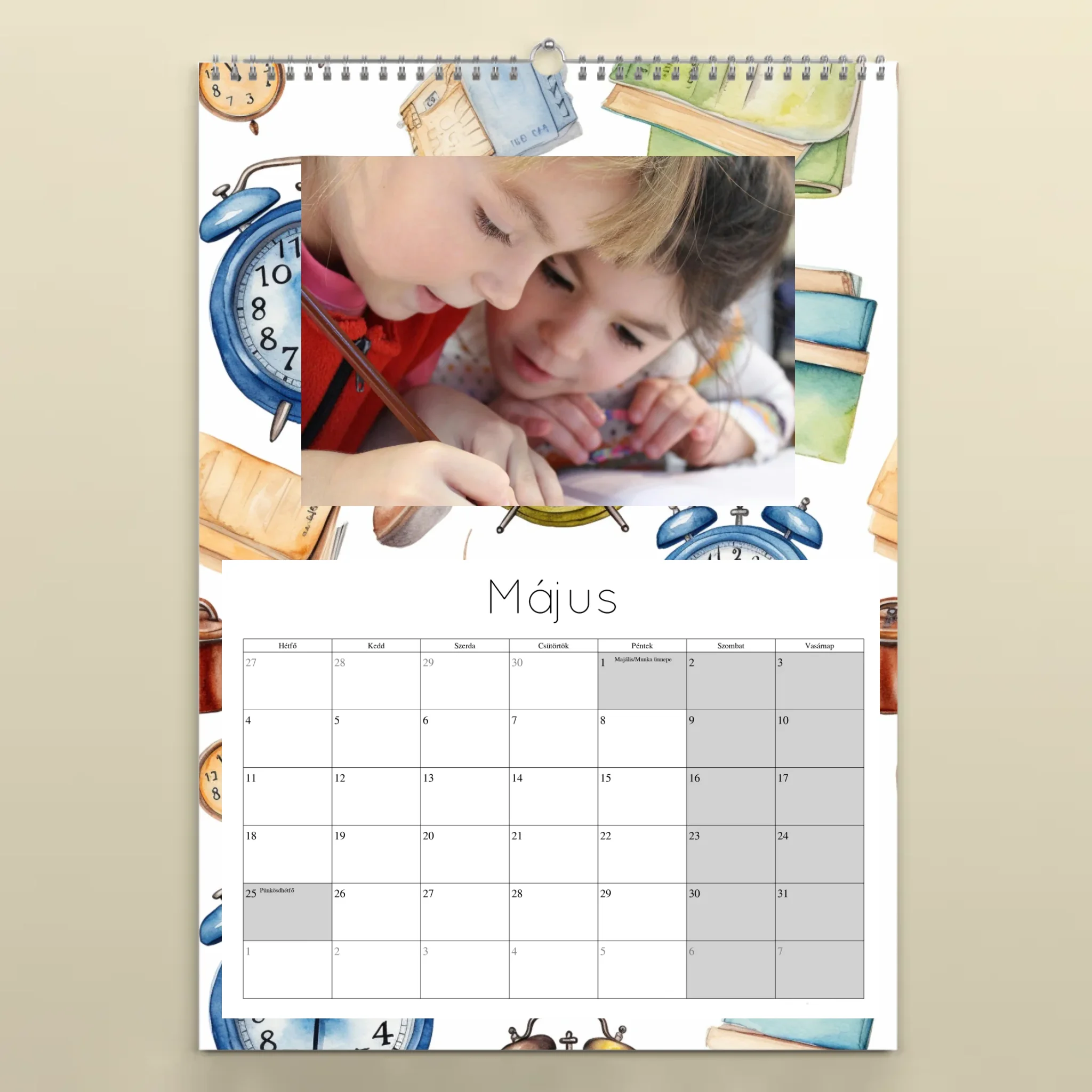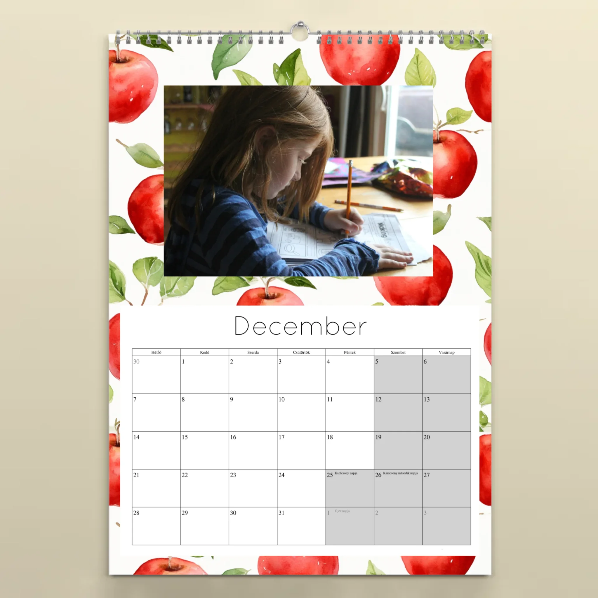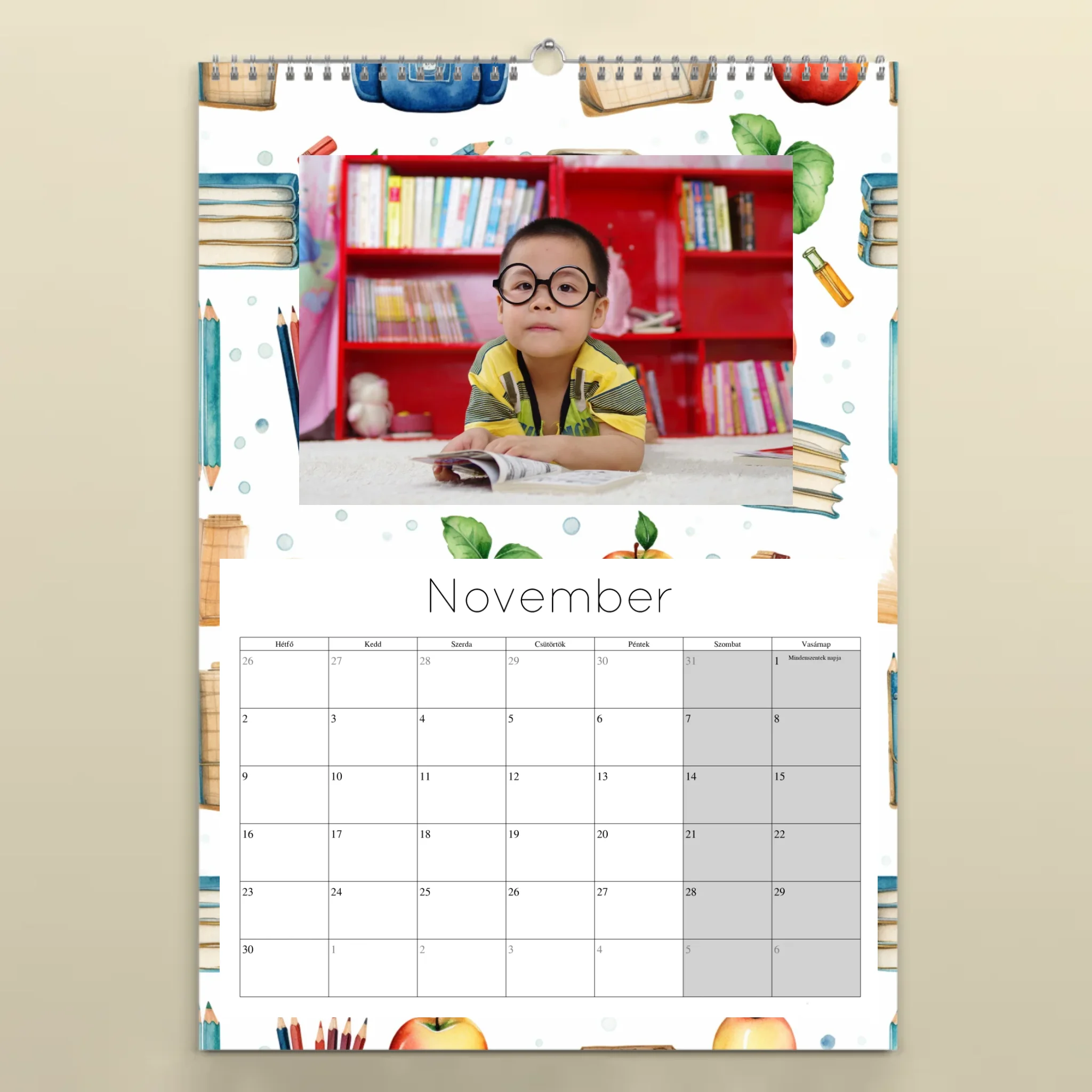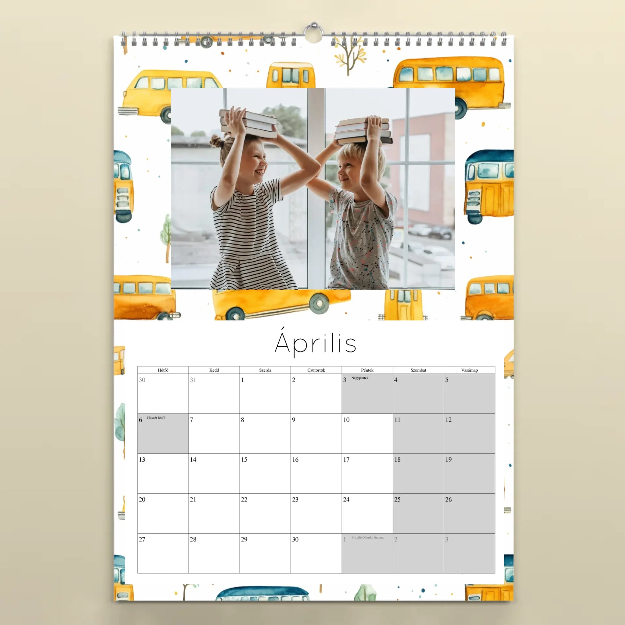 Teremts egyedi hangulatot otthonodban vagy irodádban ezzel a személyre szabott, 12 képes spirálozott falinaptárral! A naptár egy főcímlappal és 12 külön oldallal készül, így minden hónaphoz más és más kedvenc fotódat vagy képedet választhatod. Minőségi nyomtatással, tartós spirálozással és akasztólyukkal készül, hogy egész évben dísze lehessen a faladnak.