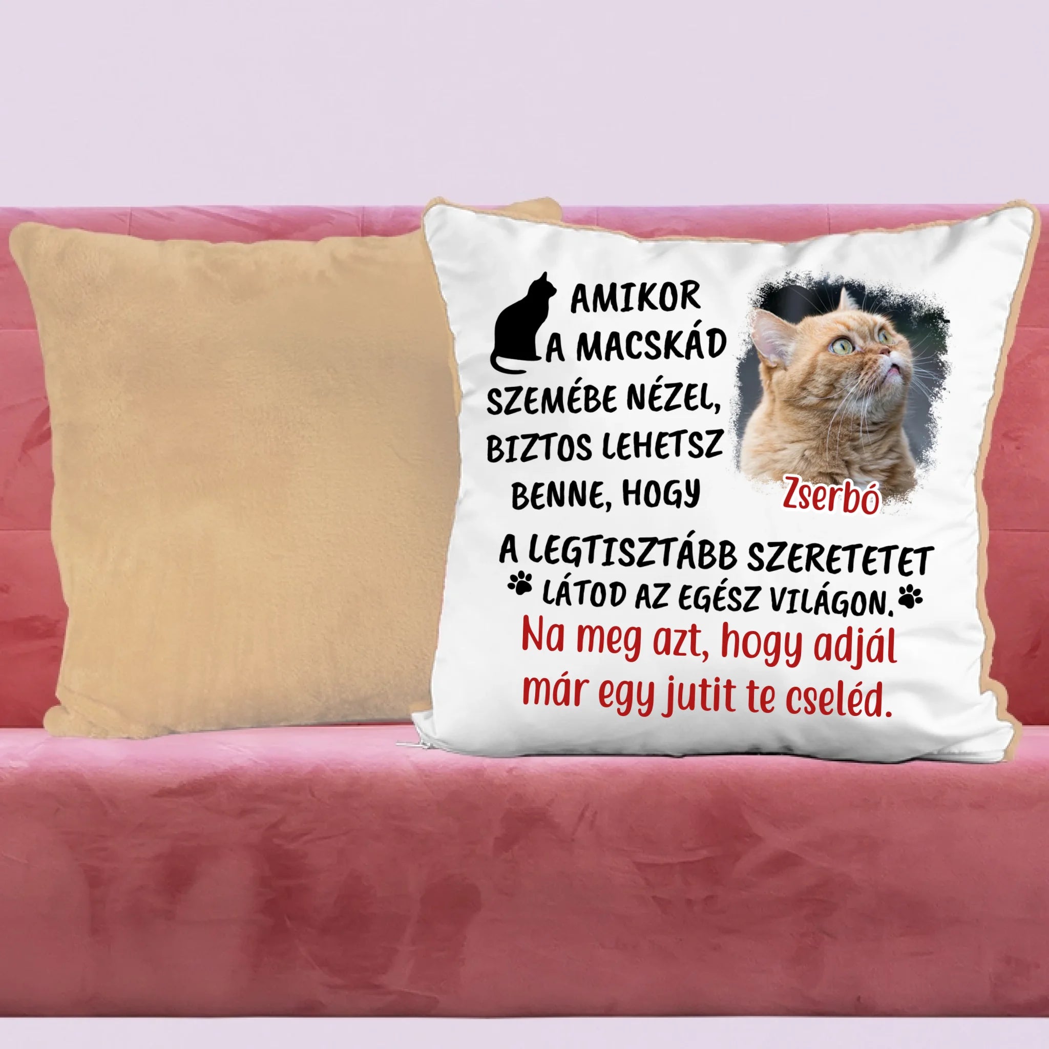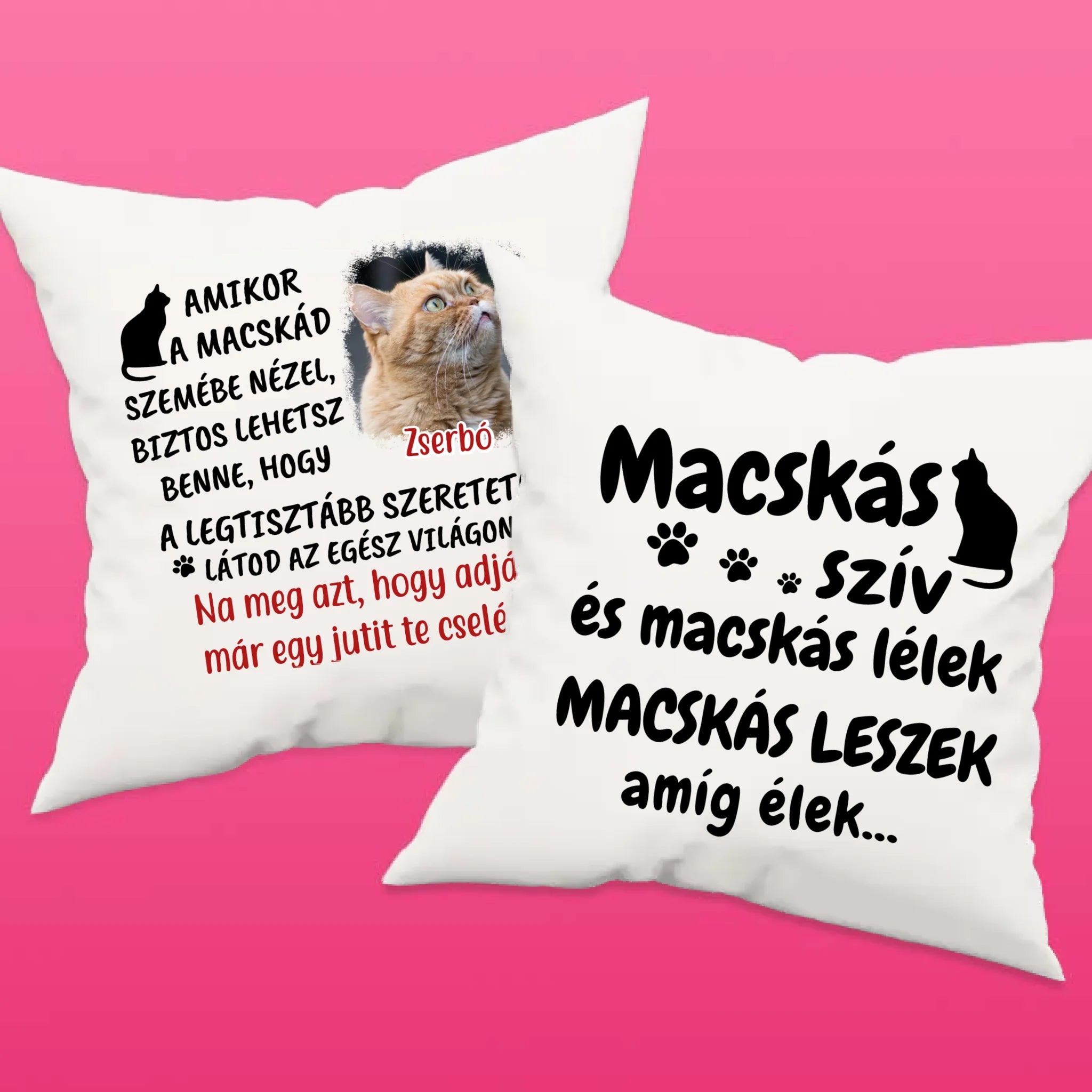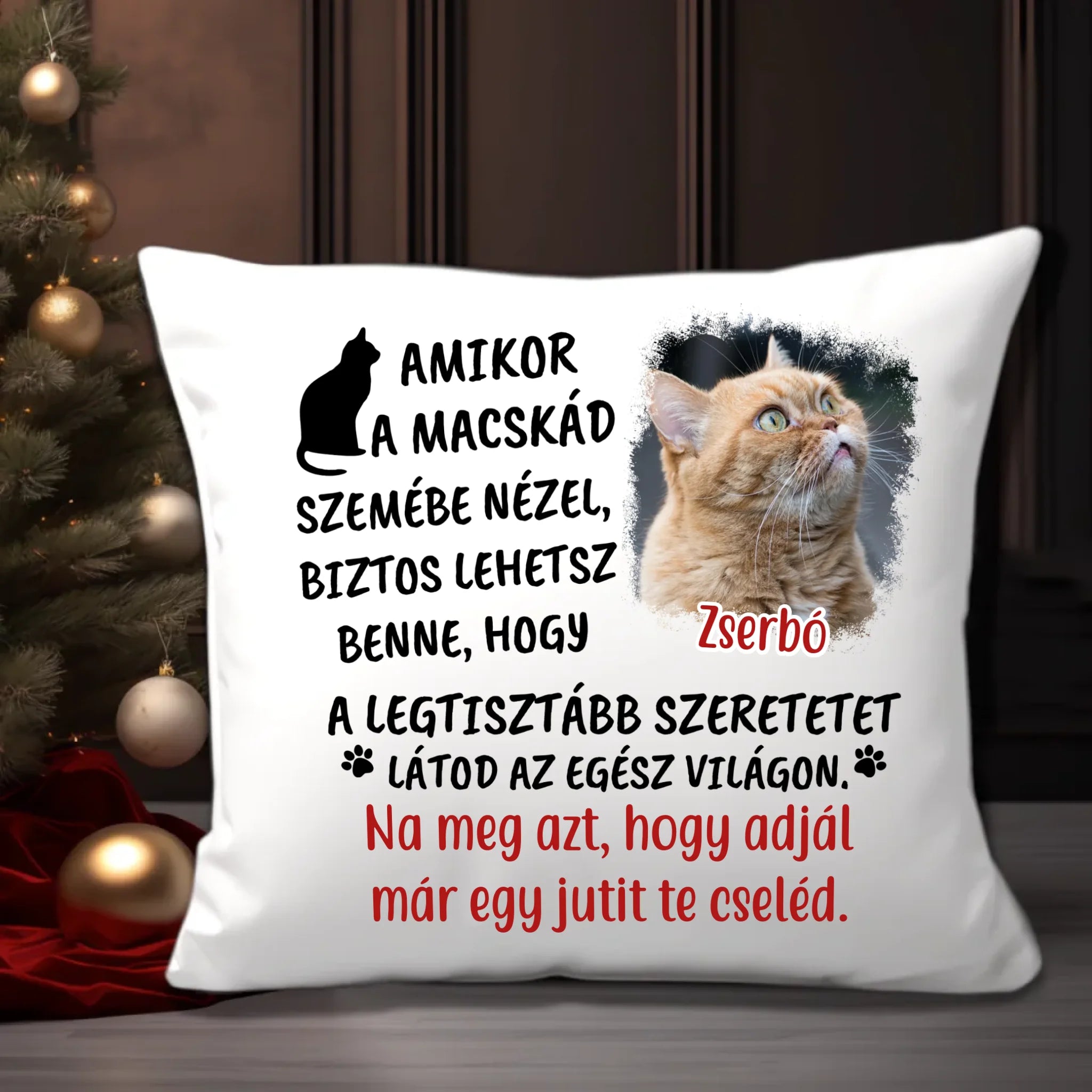 Egyedi fényképes párna macska gazdiknak személyre szabható felirattal