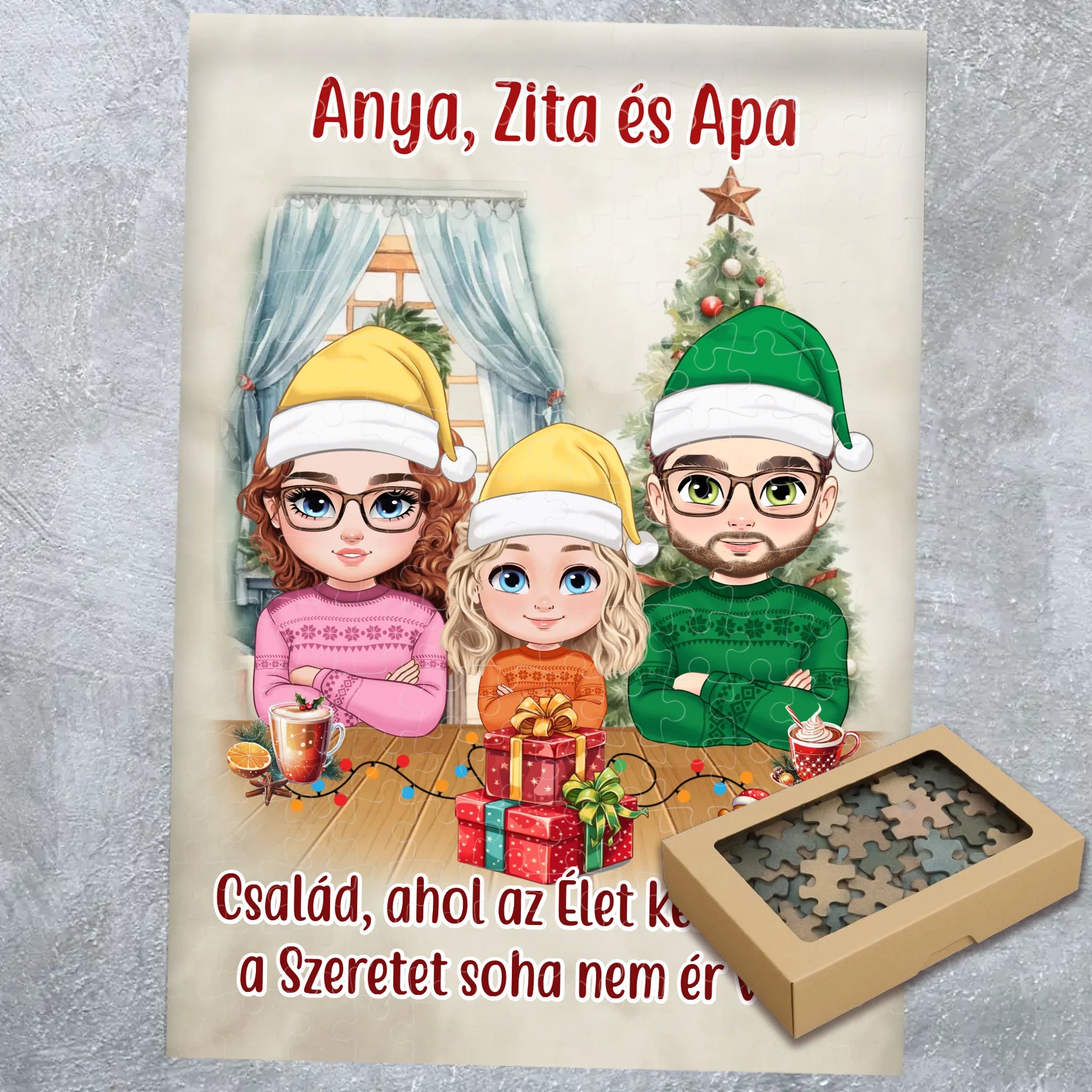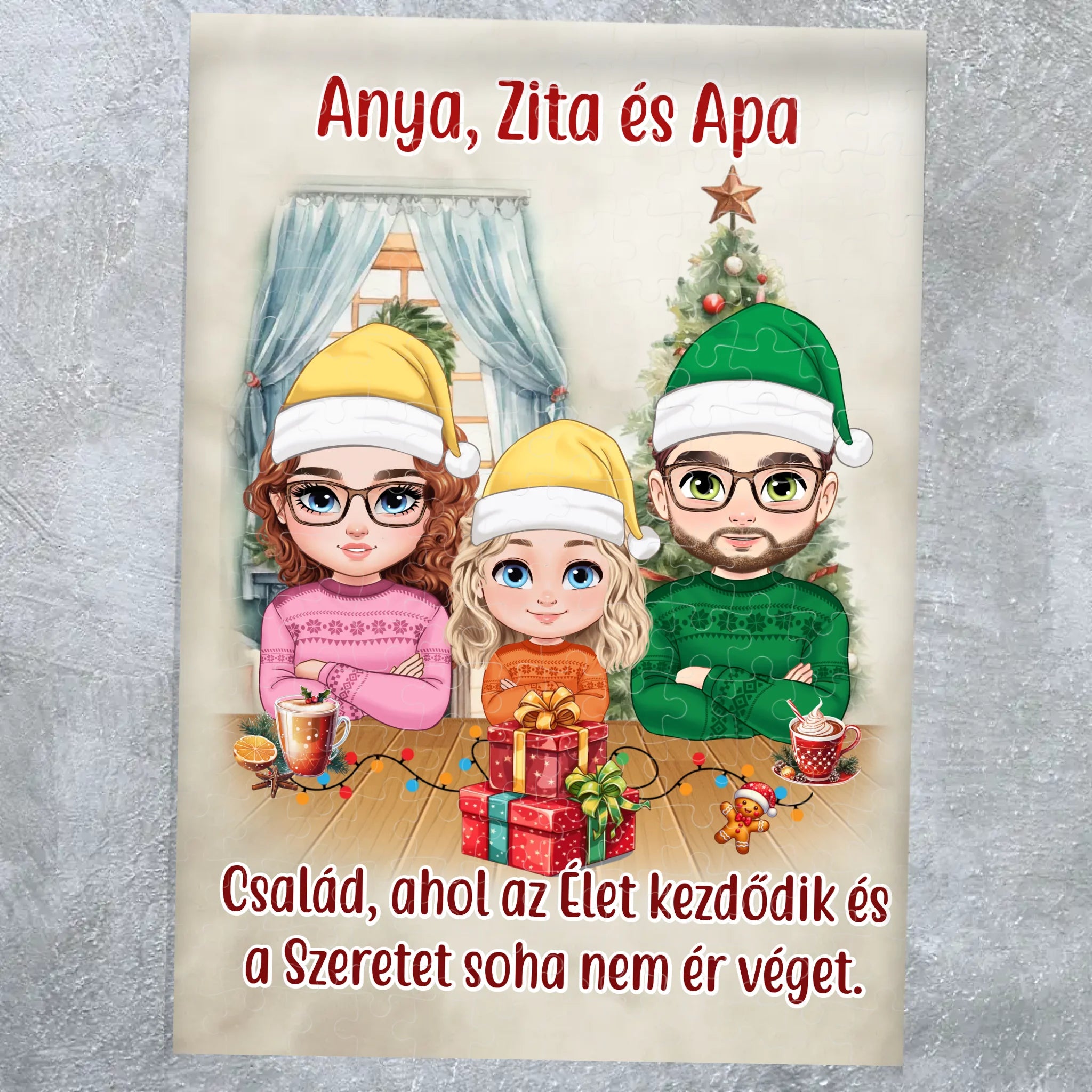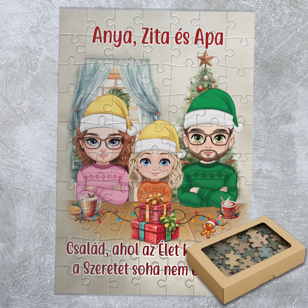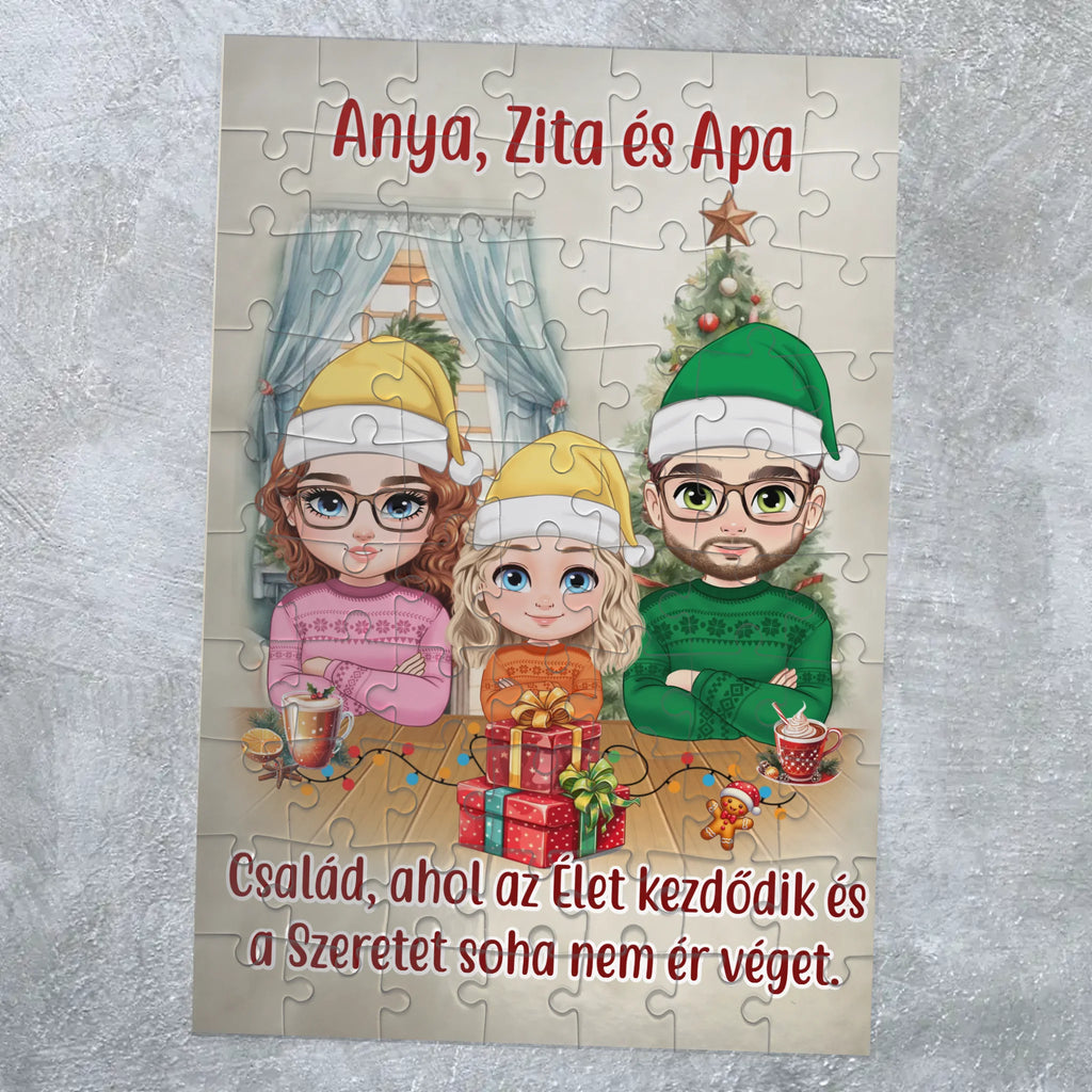 Személyre szabható karácsonyi családos puzzle – egyedi karakteres ajándék