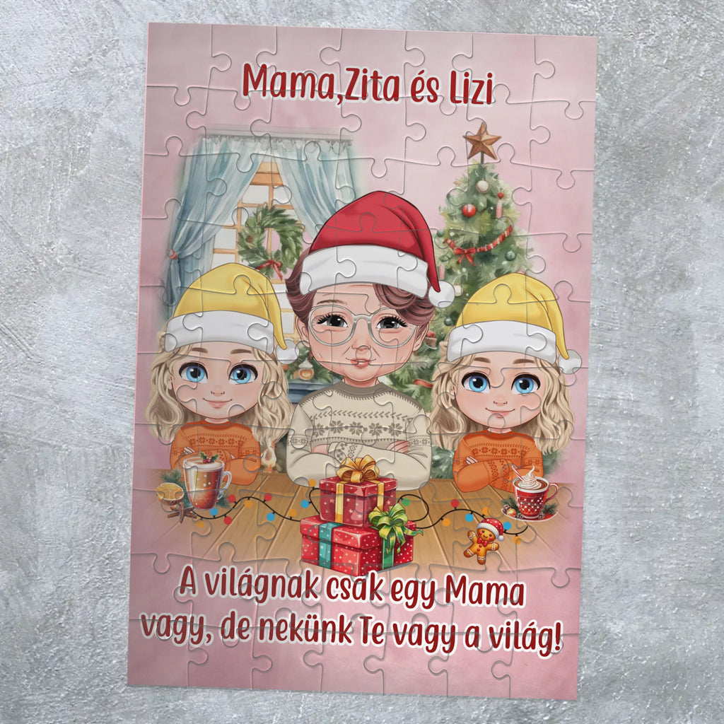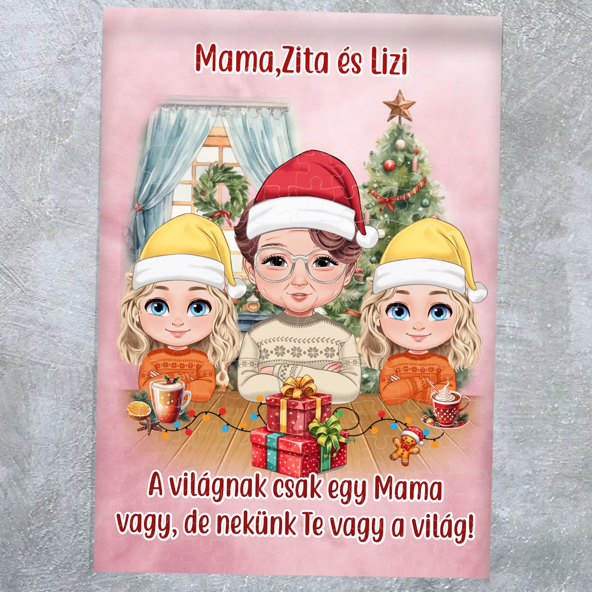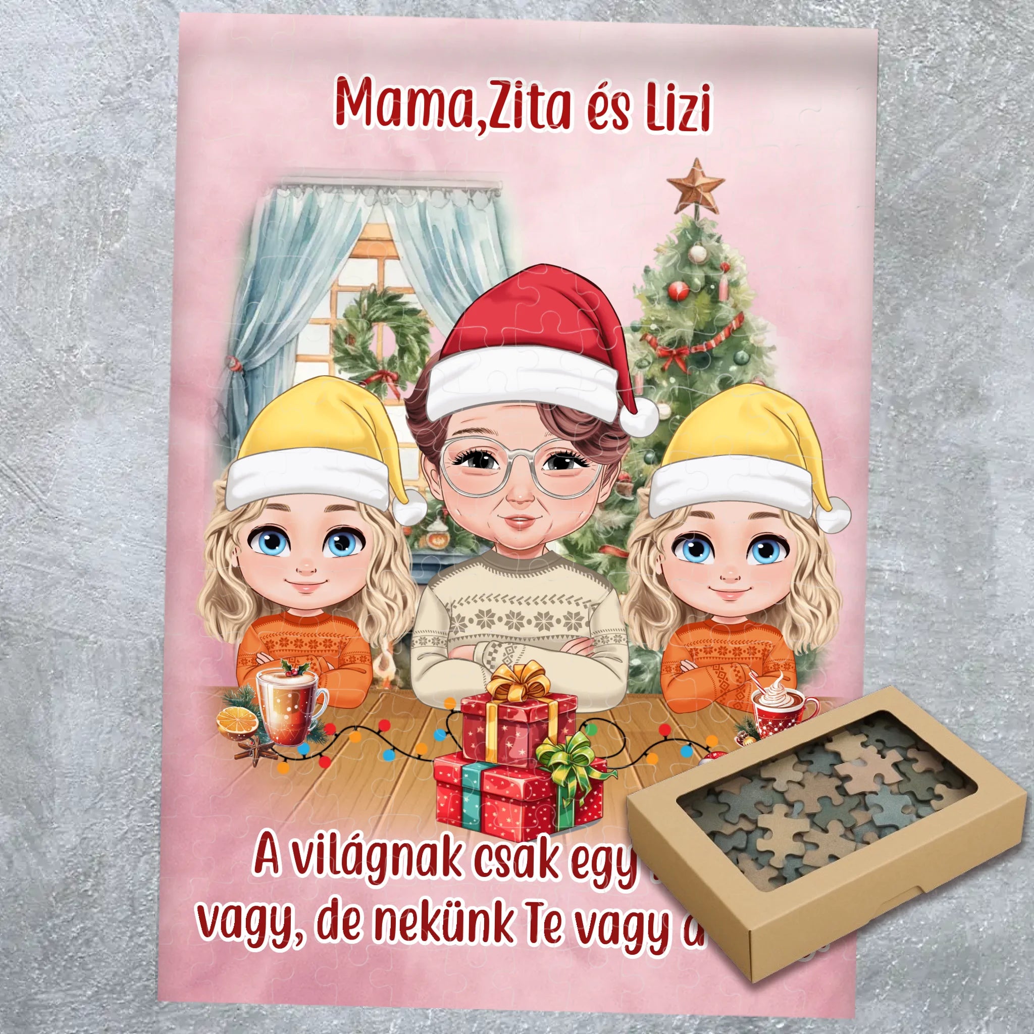 Karácsonyi egyedi puzzle személyre szabható karakterekkel – Mama és unokák