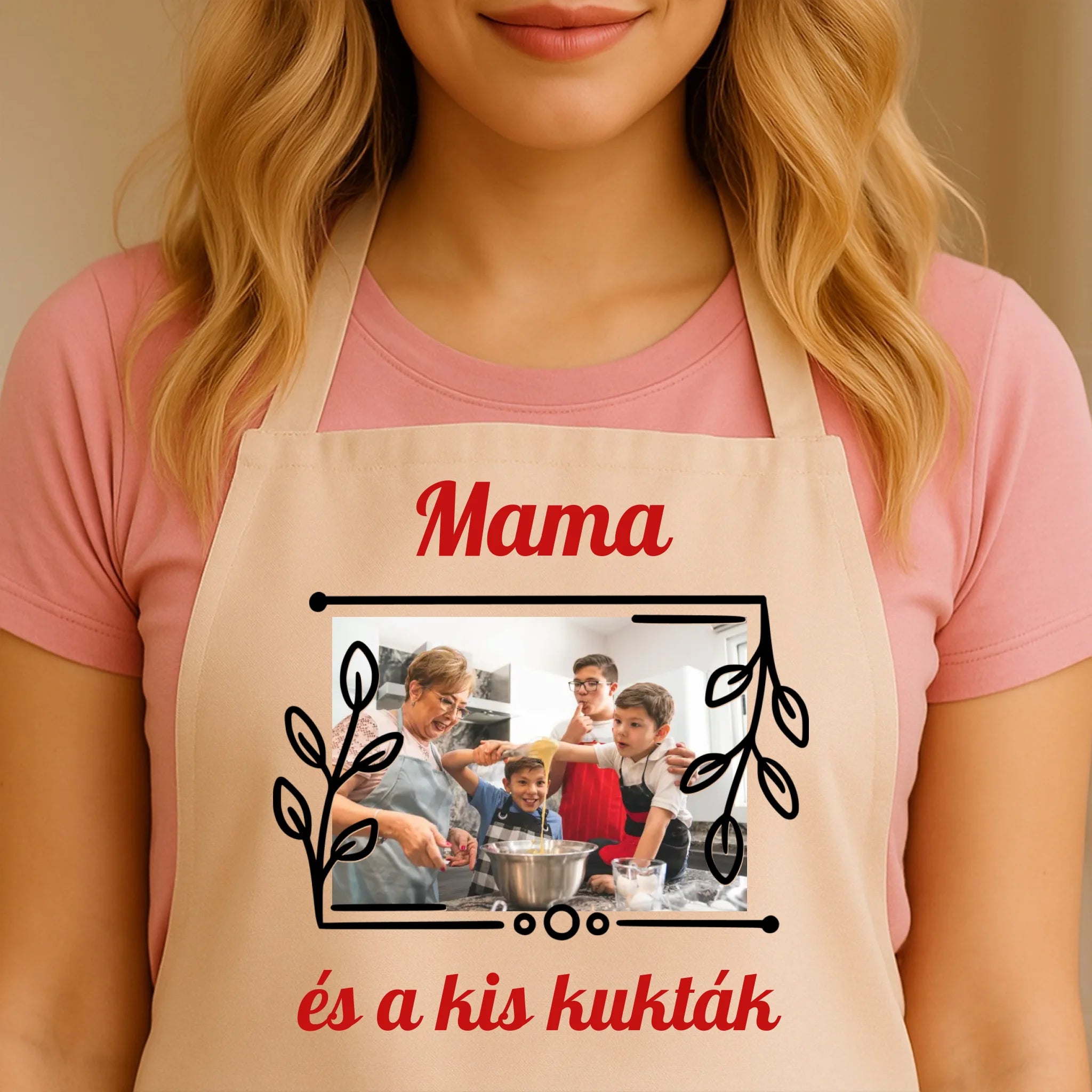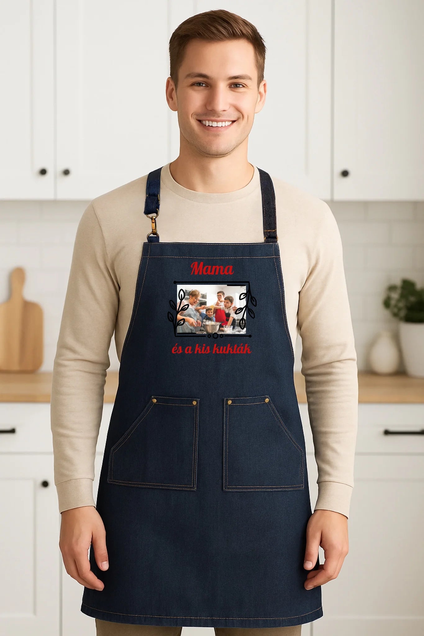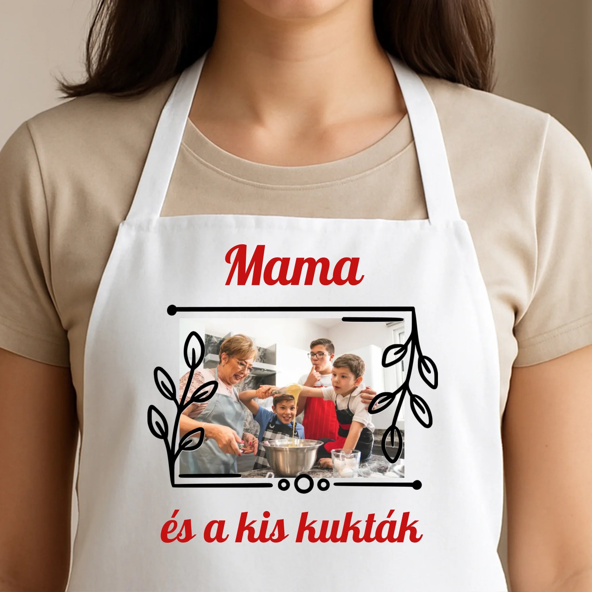 Egyedi fényképes kötény virágos kerettel és felirattal