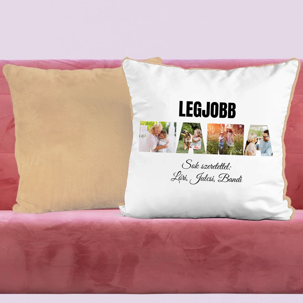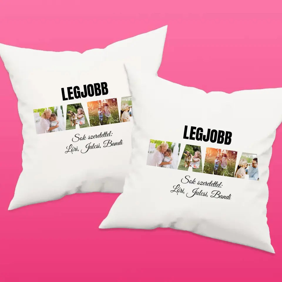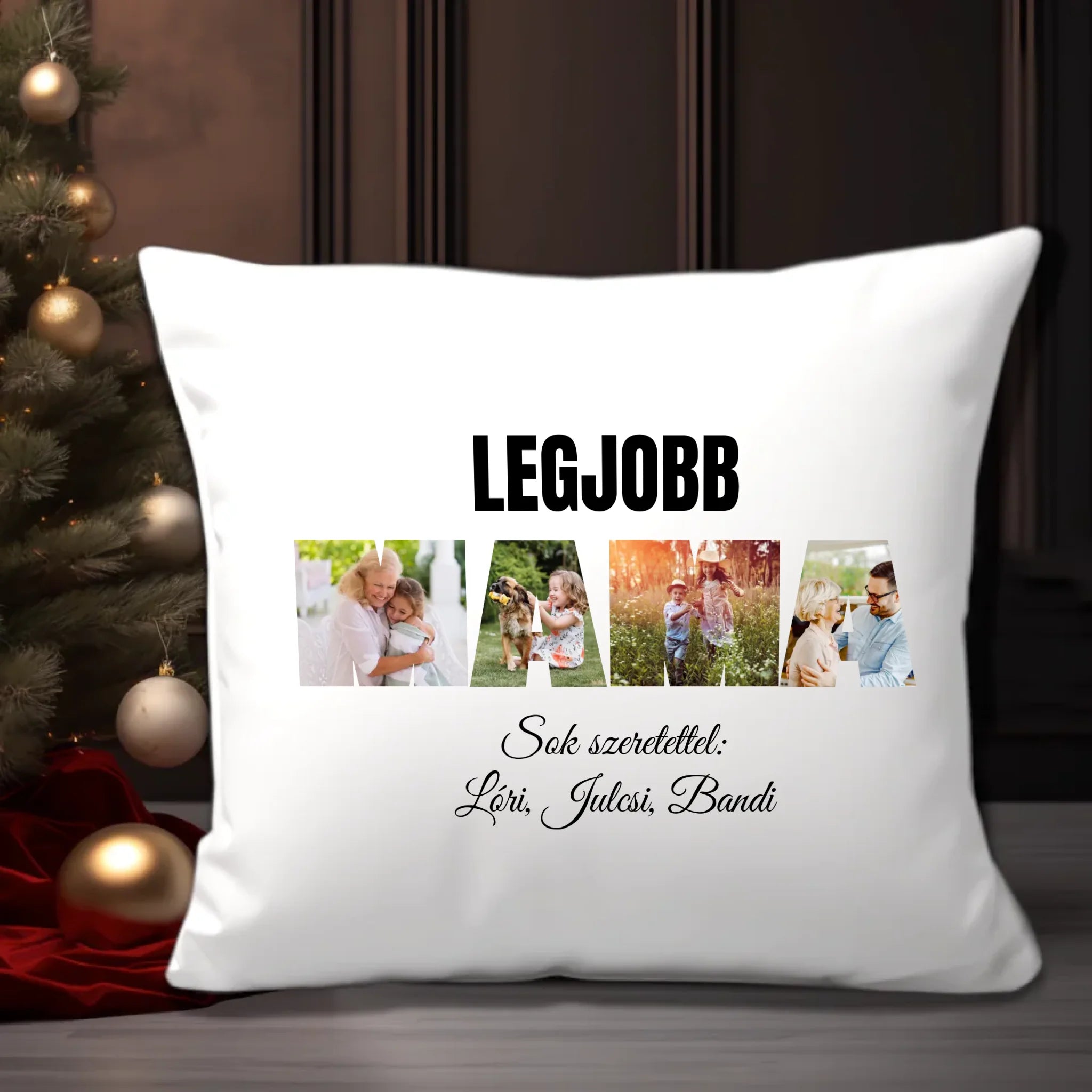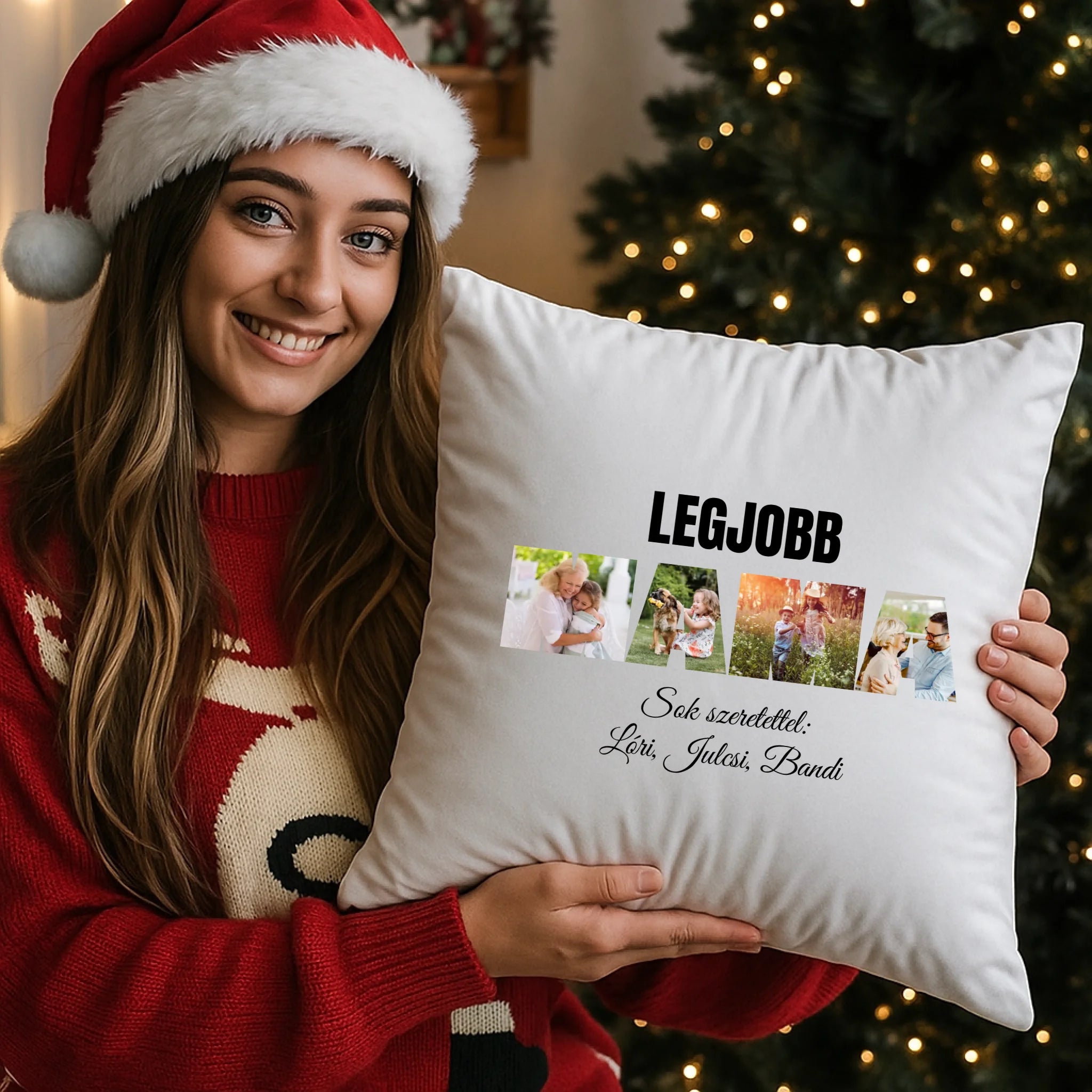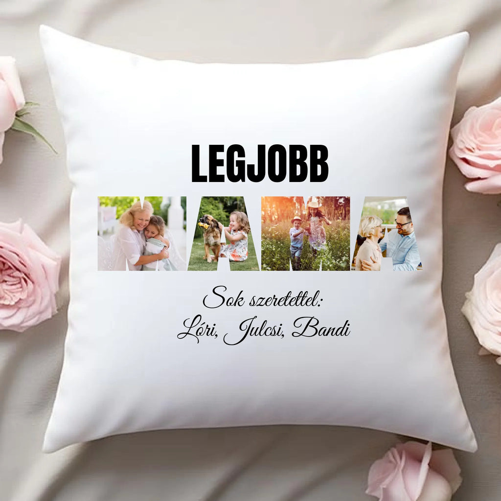 Egyedi párna anyák napjára nagymamának, melyre saját képet is kérhetsz. A kedves felirat garantálja és a MAMA formában kivágott képek garantáltan mosolyt csalnak nagymamád arcára, legyen szó anyák napjáról, születésnapról, névnapról vagy karácsonyról.