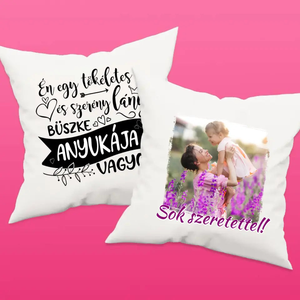 Egyedi párna vicces felirattal anyák napjára, melyre saját képet is kérhetsz. A vicces " Én egy tökéletes és szerény lány büszke anyukája vagyok" felirat garantálja, hogy mosolyt csalj édesanyád arcára, legyen szó anyák napjáról, születésnapról, névnapról vagy karácsonyról.