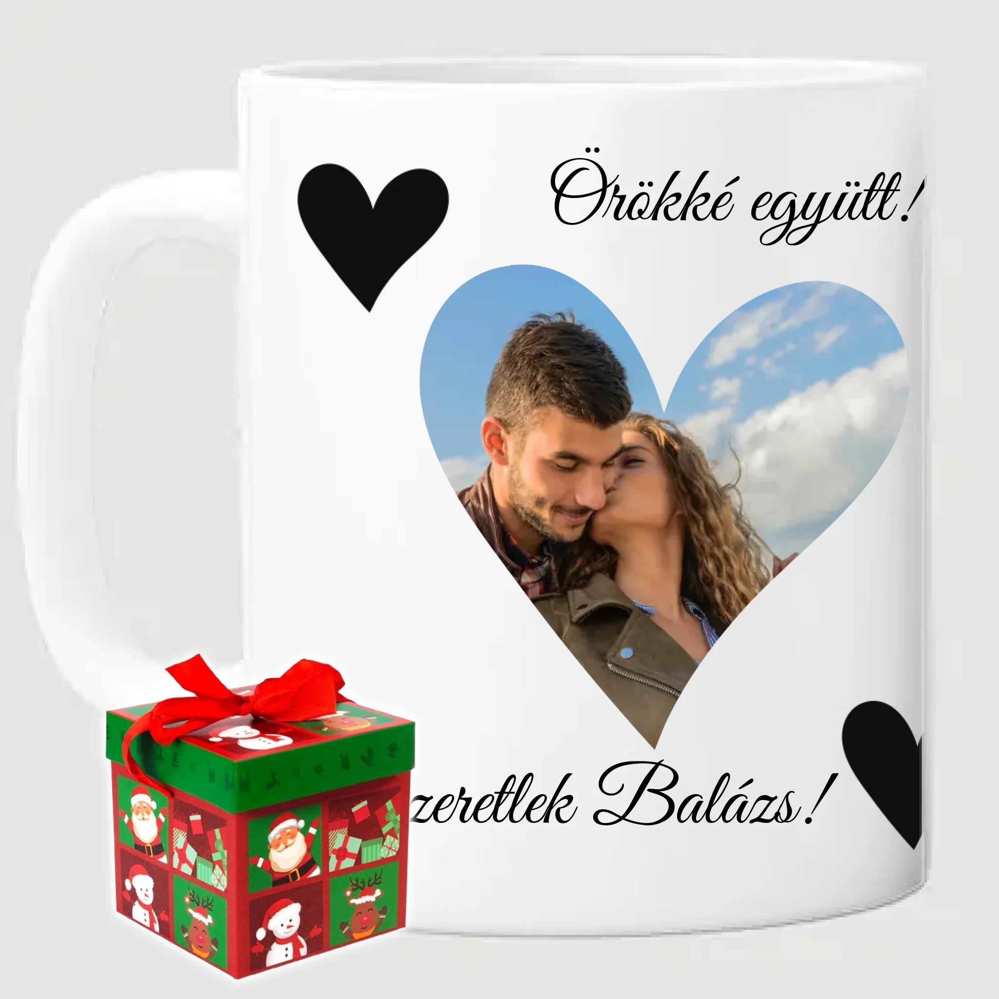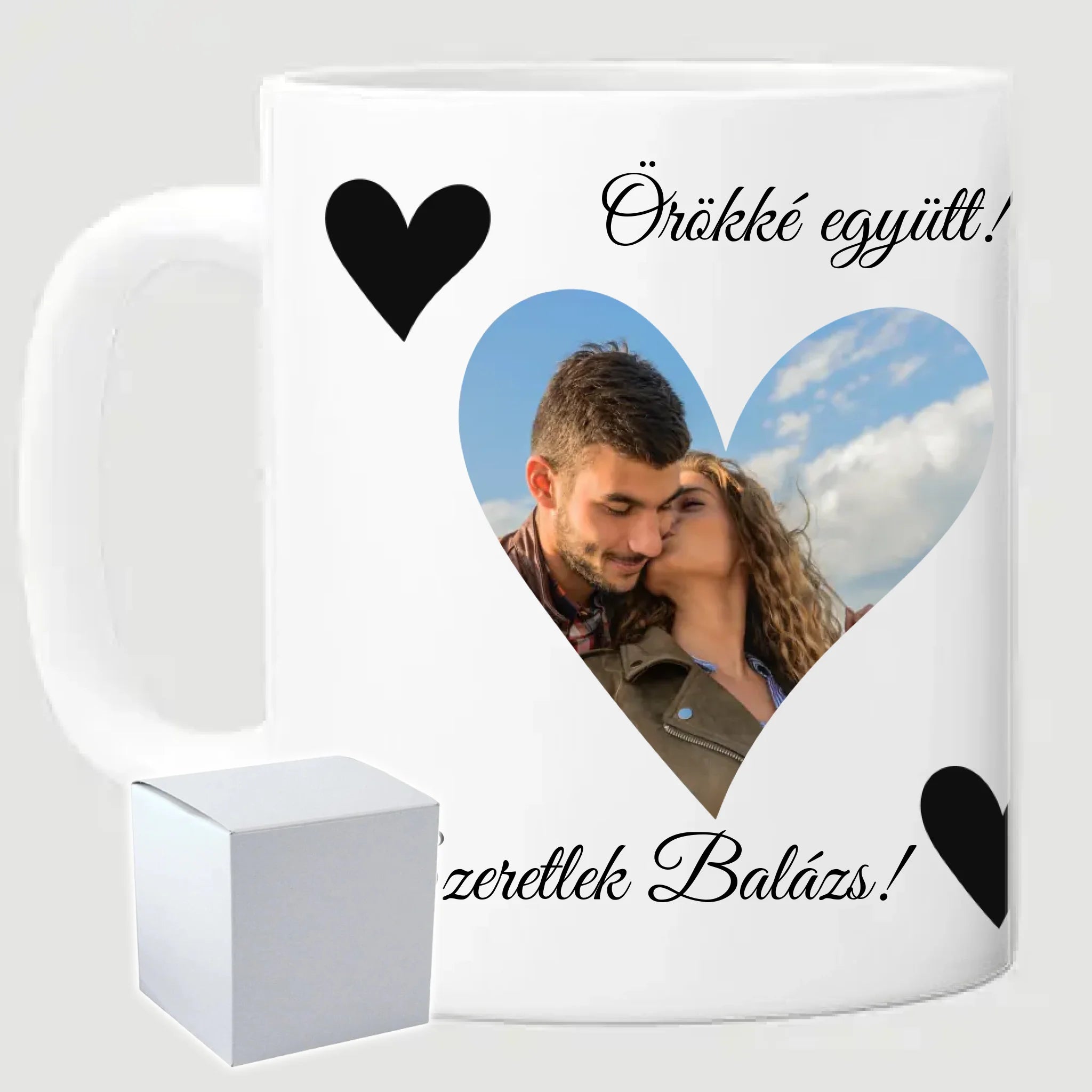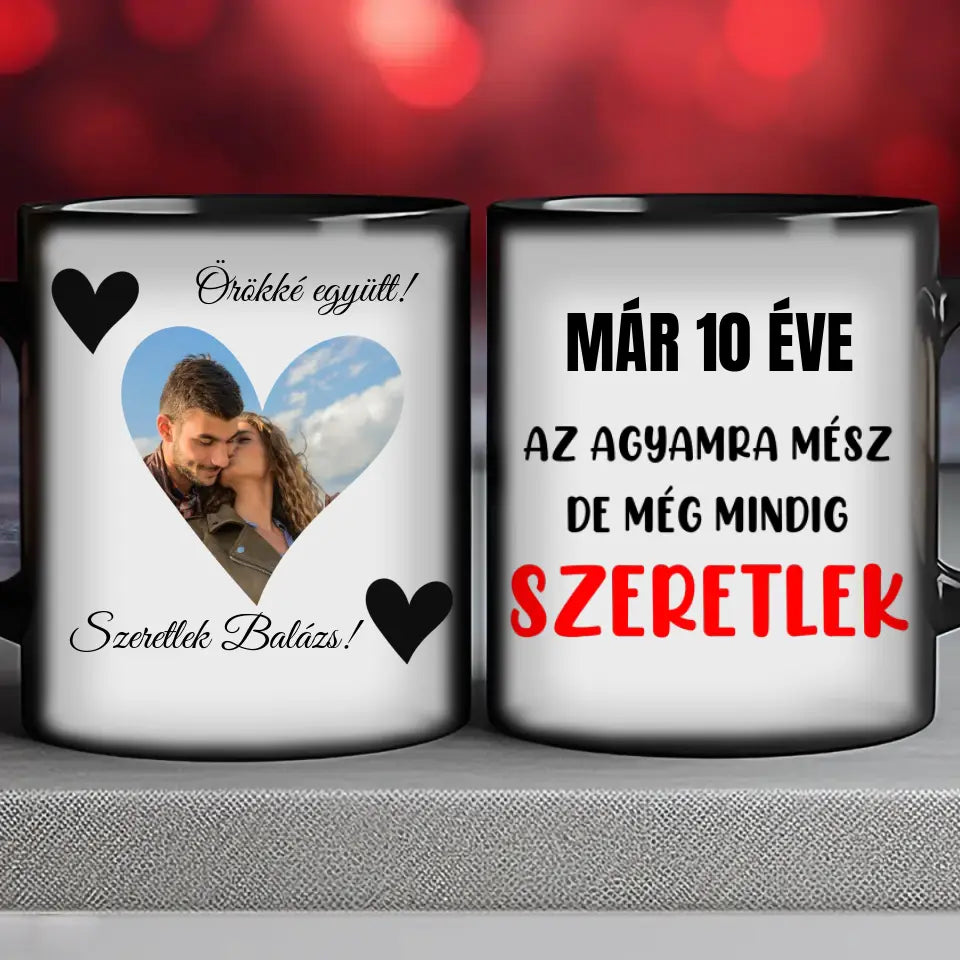 Egyedi fényképes bögre a saját fotóddal. Az egyedi fényképes bögre remek ajándék Valentin napra és évfordulóra is. Az egyedi bögre nyomtatása nagyon magas hőfokon történik, ezáltal az anyag szerkezetébe sütjük bele, így a nyomat rendkívül tartós lesz és nem kopik, nem fakul ki. A fényképes bögréhez bármilyen fotót választhatsz, illetve feliratot is adhatsz hozzá.