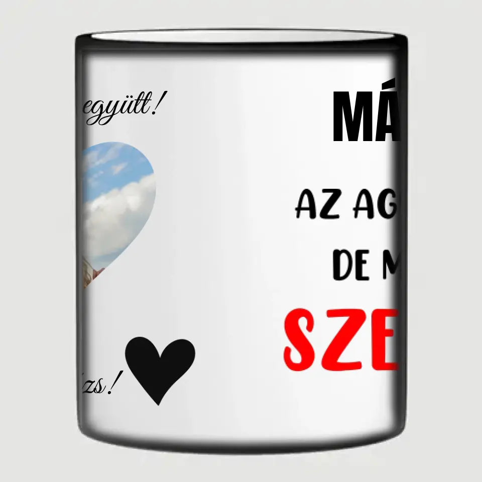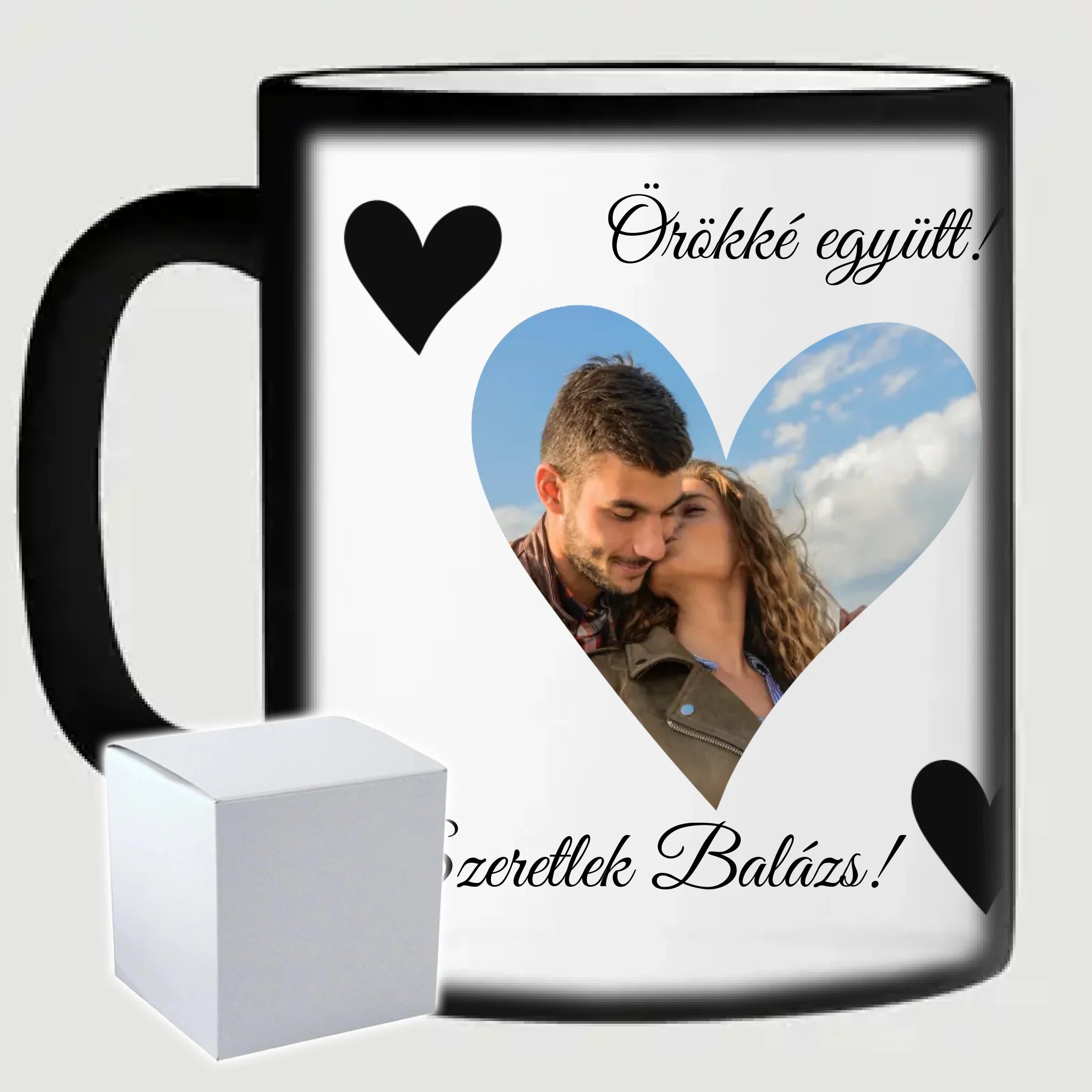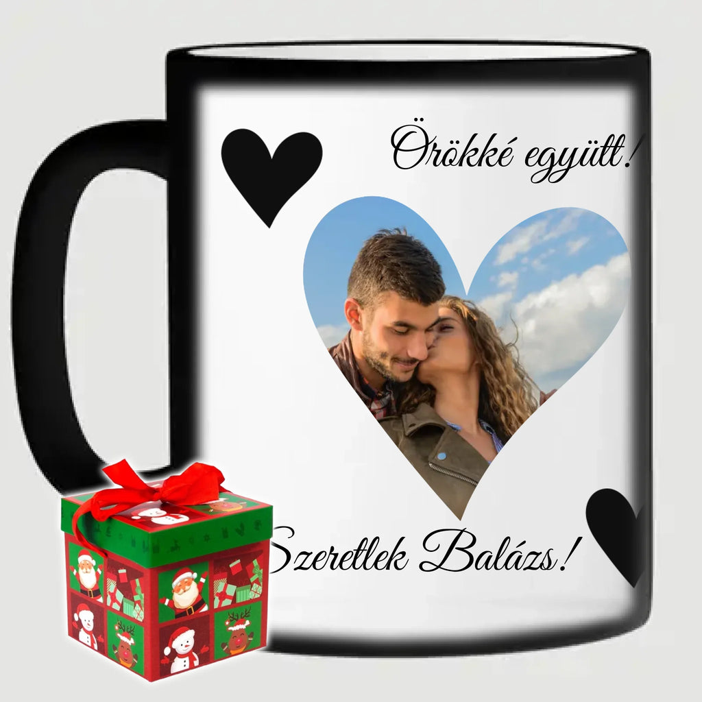 Egyedi fényképes bögre a saját fotóddal. Az egyedi fényképes bögre remek ajándék Valentin napra és évfordulóra is. Az egyedi bögre nyomtatása nagyon magas hőfokon történik, ezáltal az anyag szerkezetébe sütjük bele, így a nyomat rendkívül tartós lesz és nem kopik, nem fakul ki. A fényképes bögréhez bármilyen fotót választhatsz, illetve feliratot is adhatsz hozzá.
