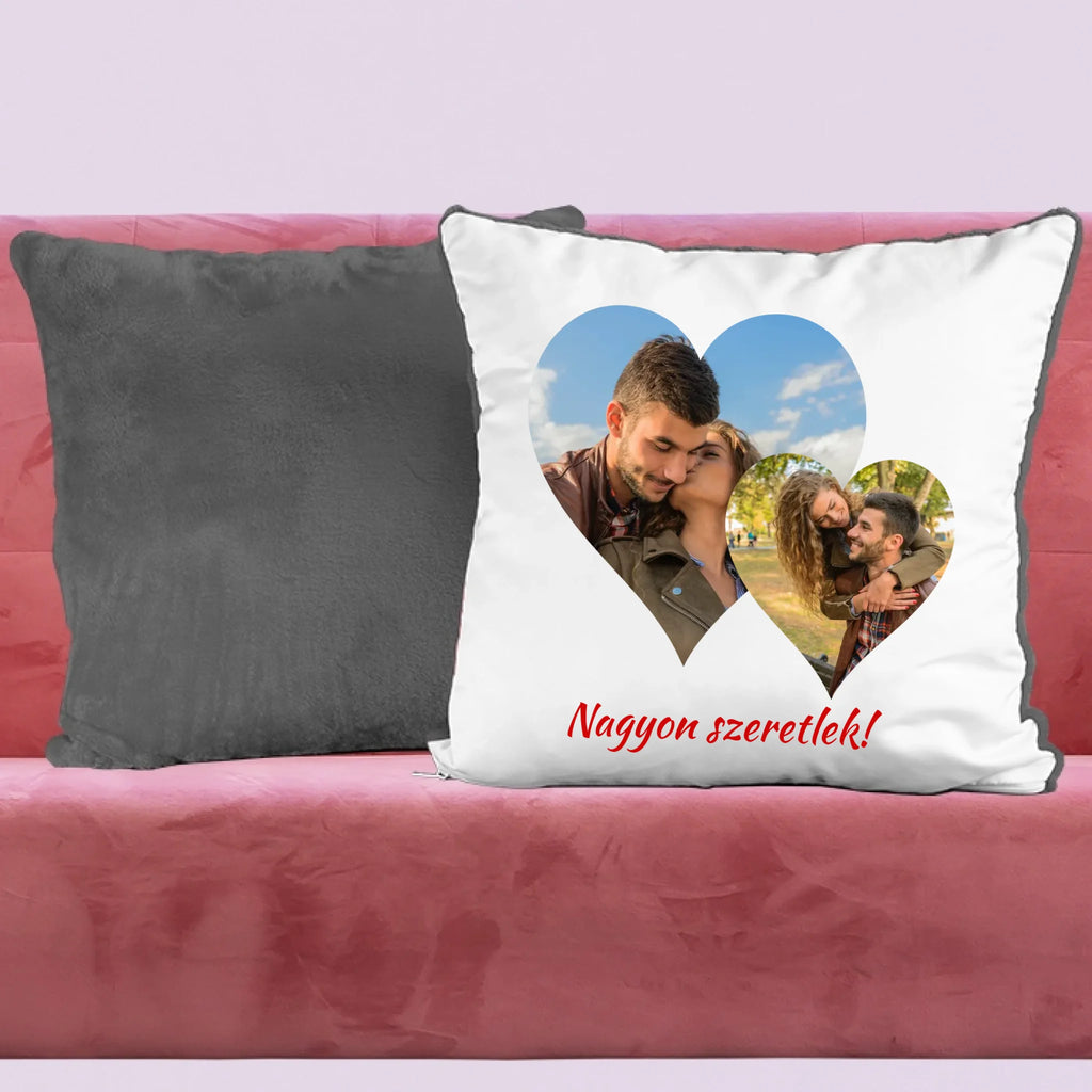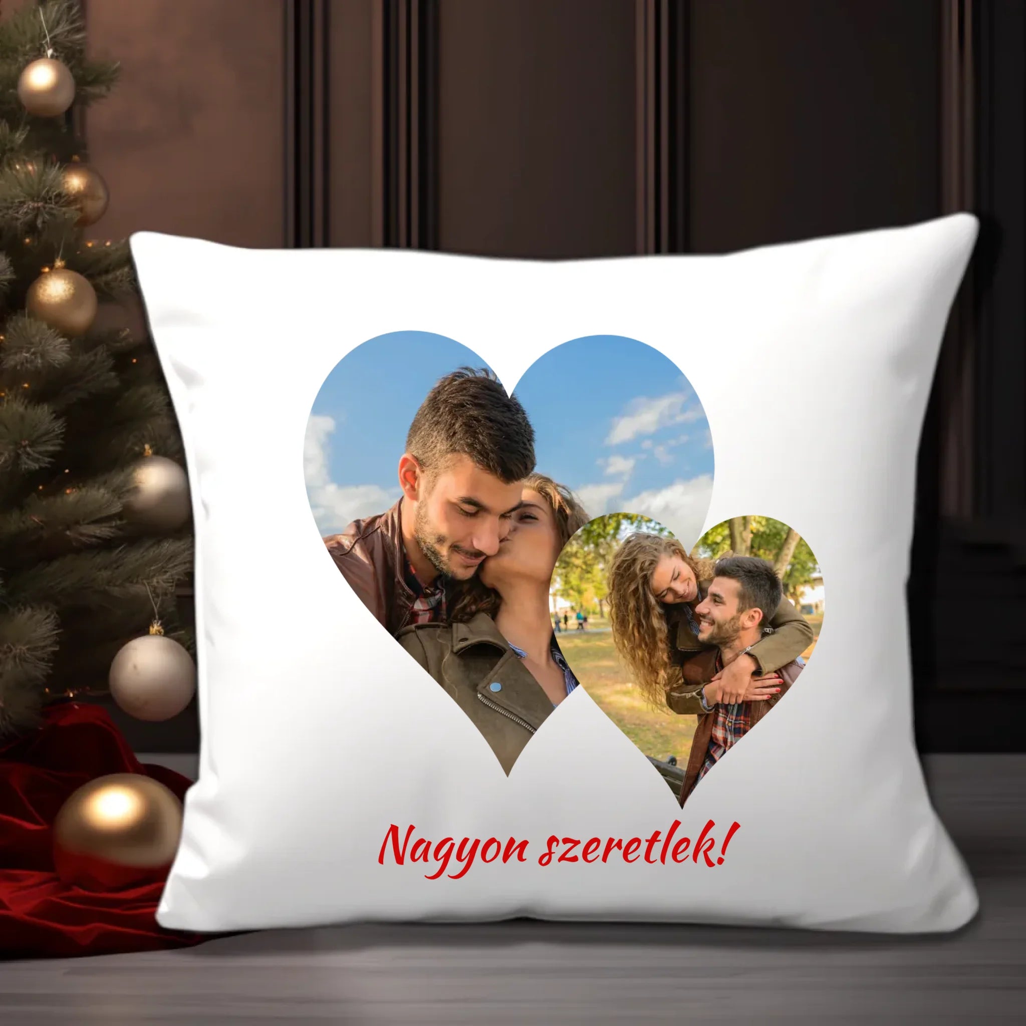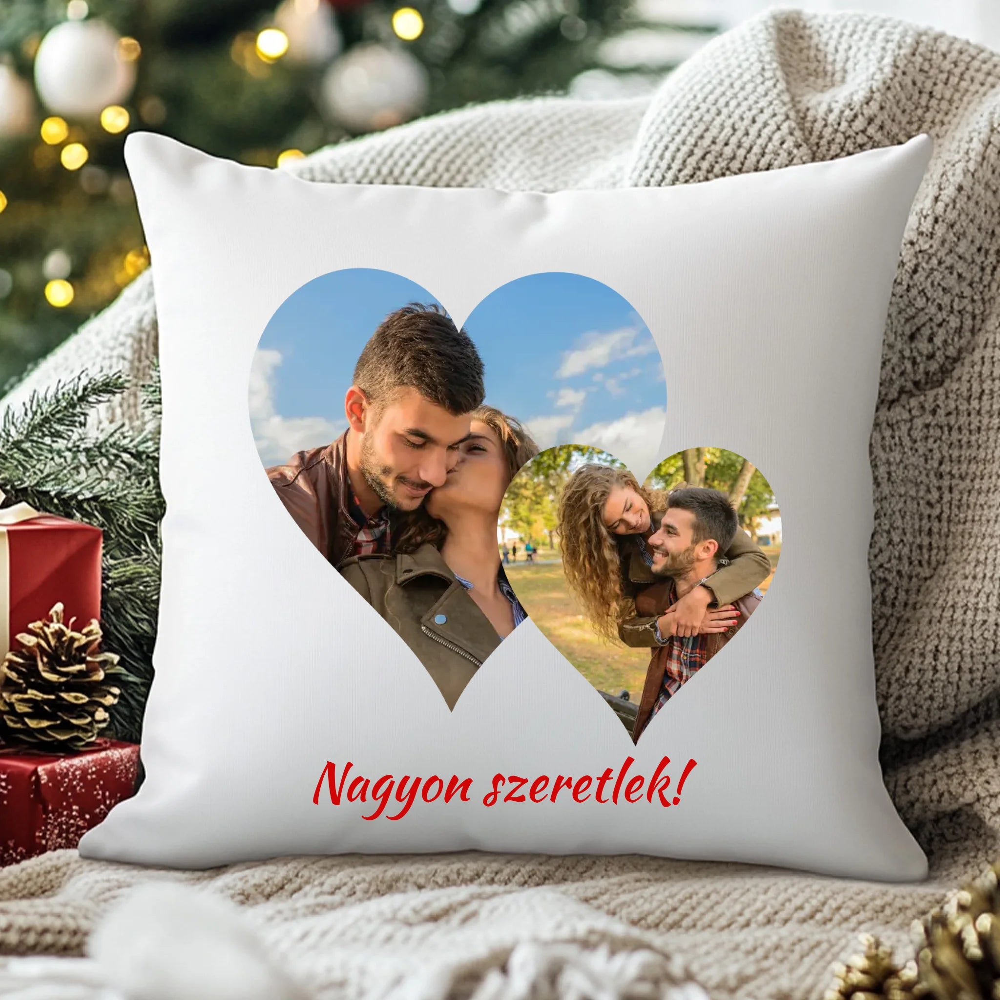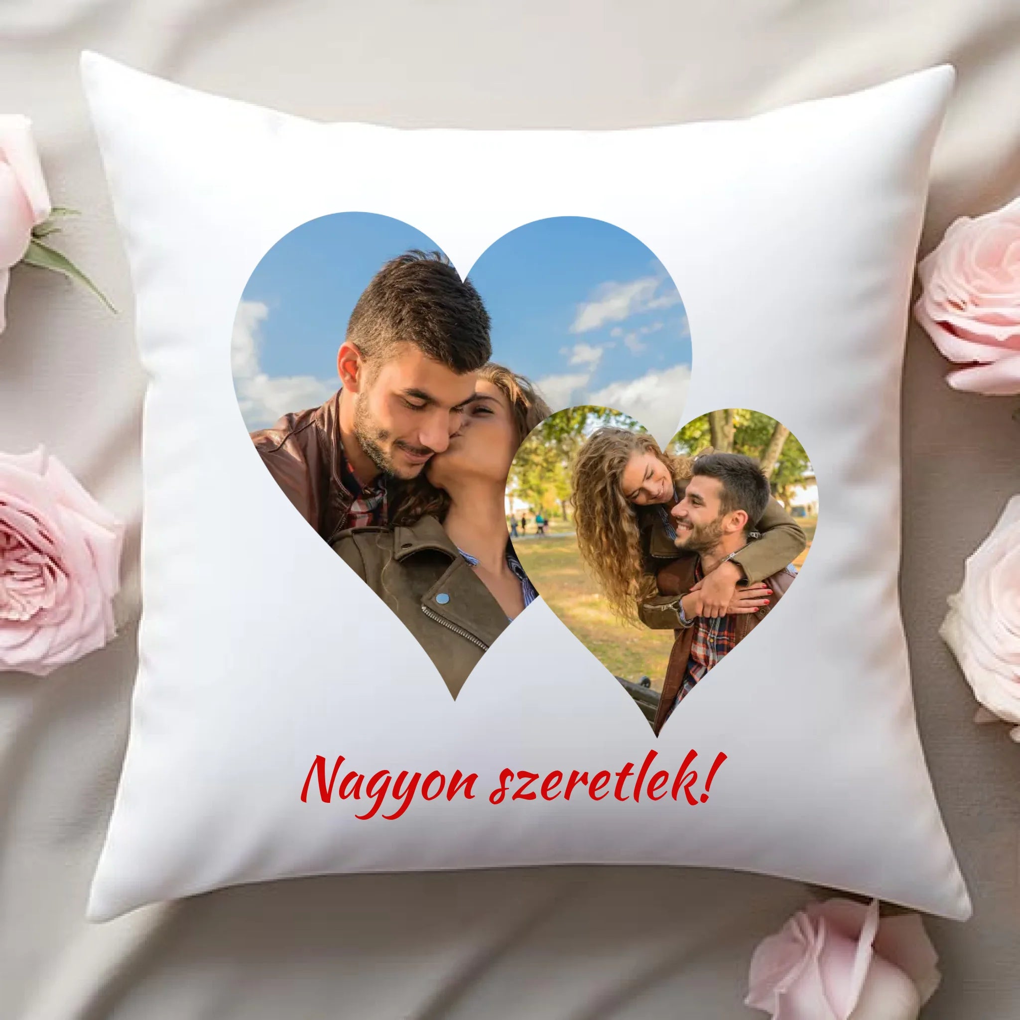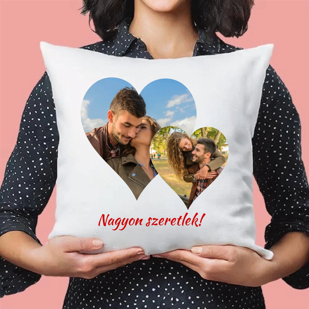 Egyedi fényképes párna, 2 saját képeddel, melyek szív alakúra vannak vágva. Tökéletes ajándék párodnak Valentin napra vagy évfordulóra!