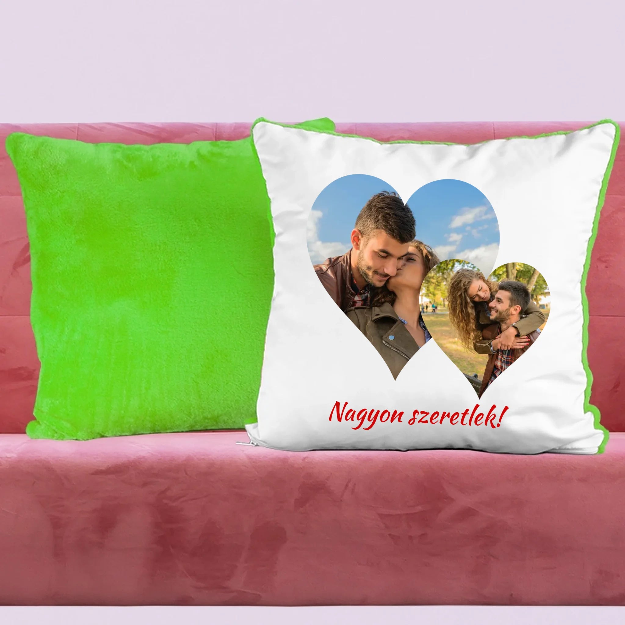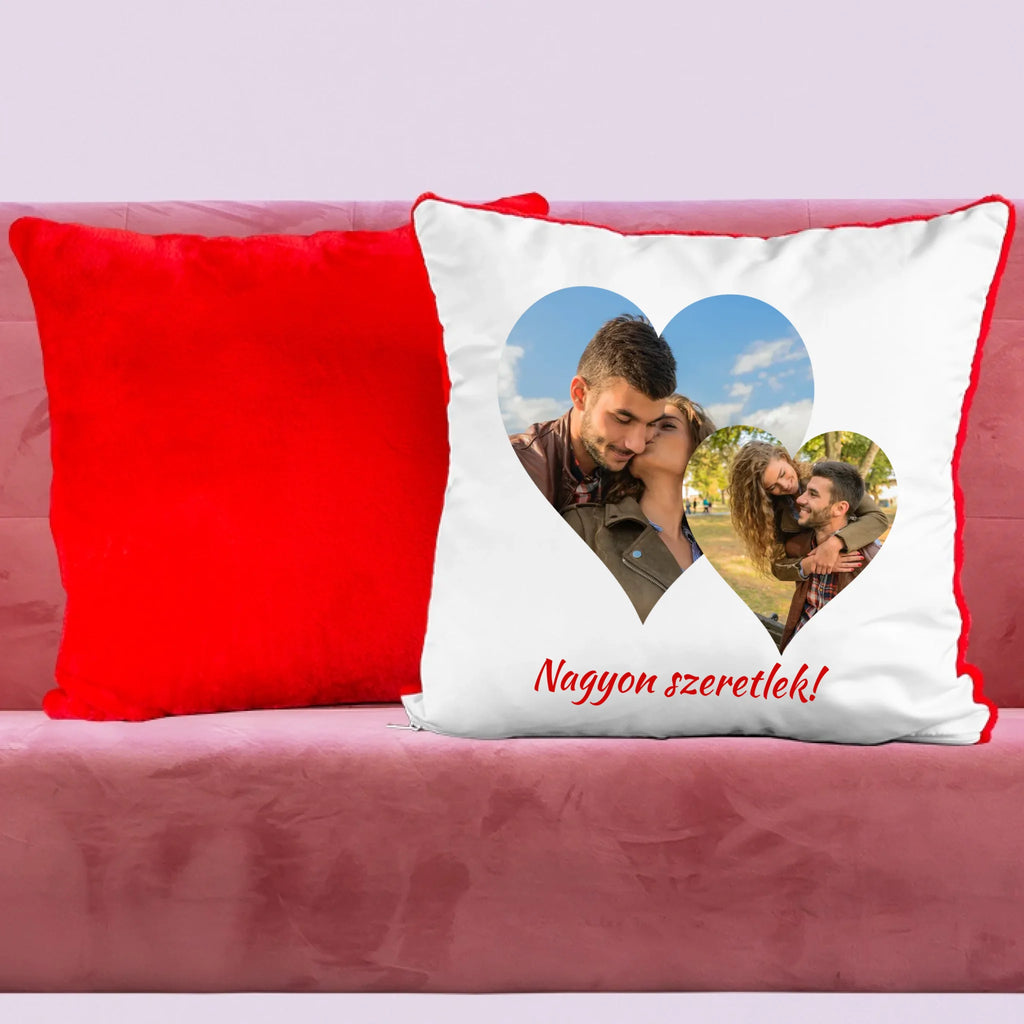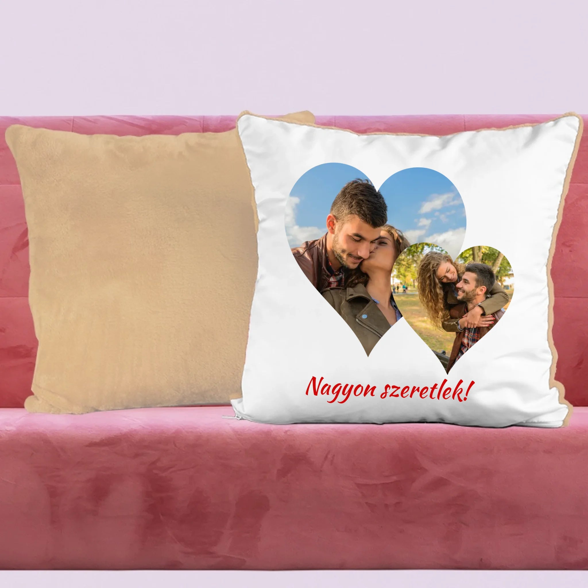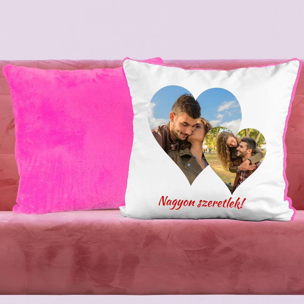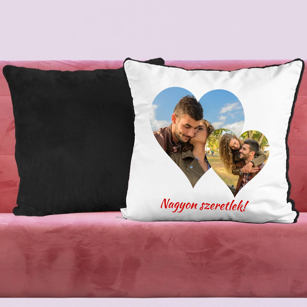 Egyedi fényképes párna, 2 saját képeddel, melyek szív alakúra vannak vágva. Tökéletes ajándék párodnak Valentin napra vagy évfordulóra!