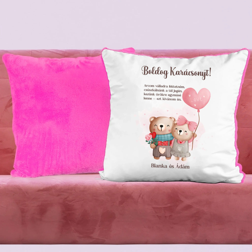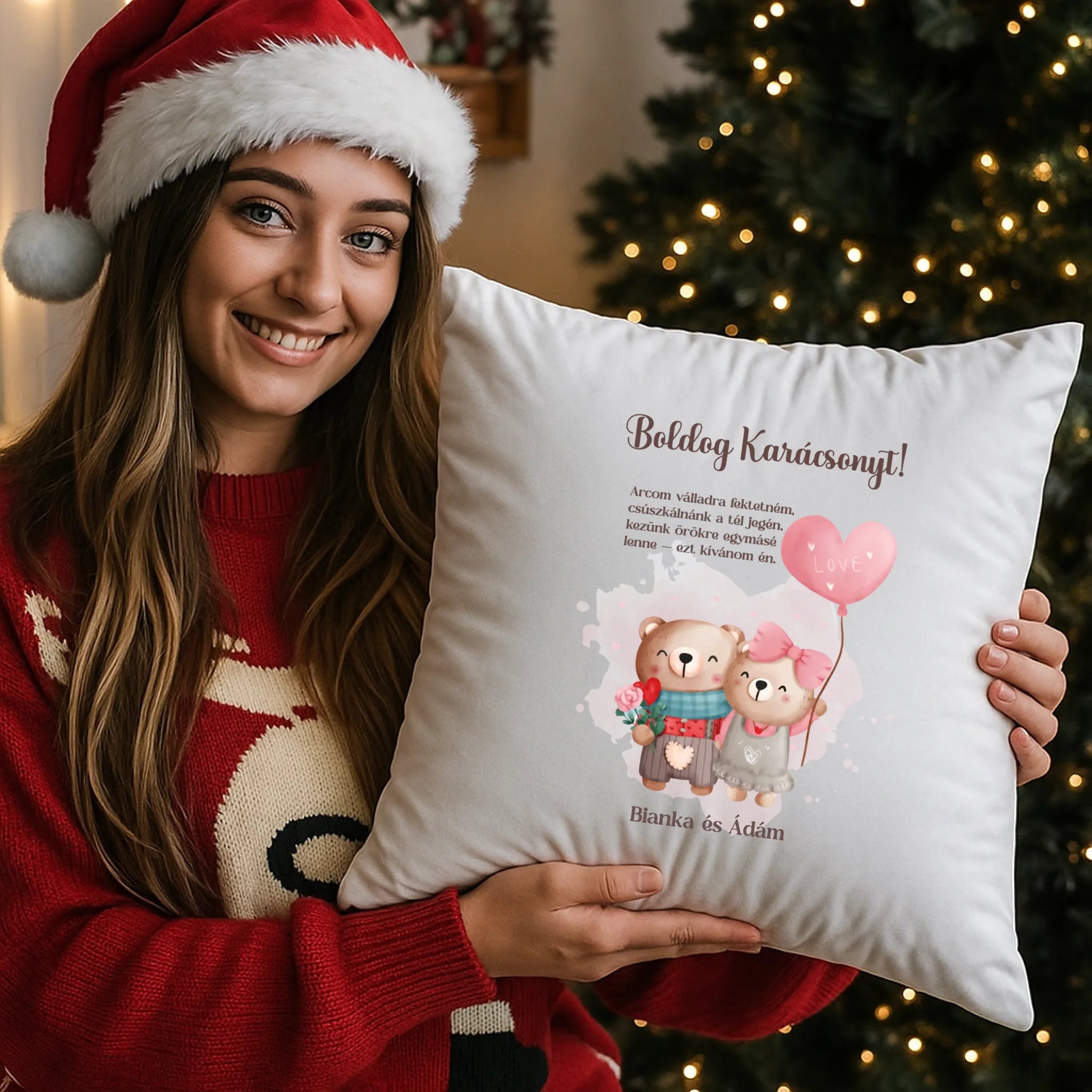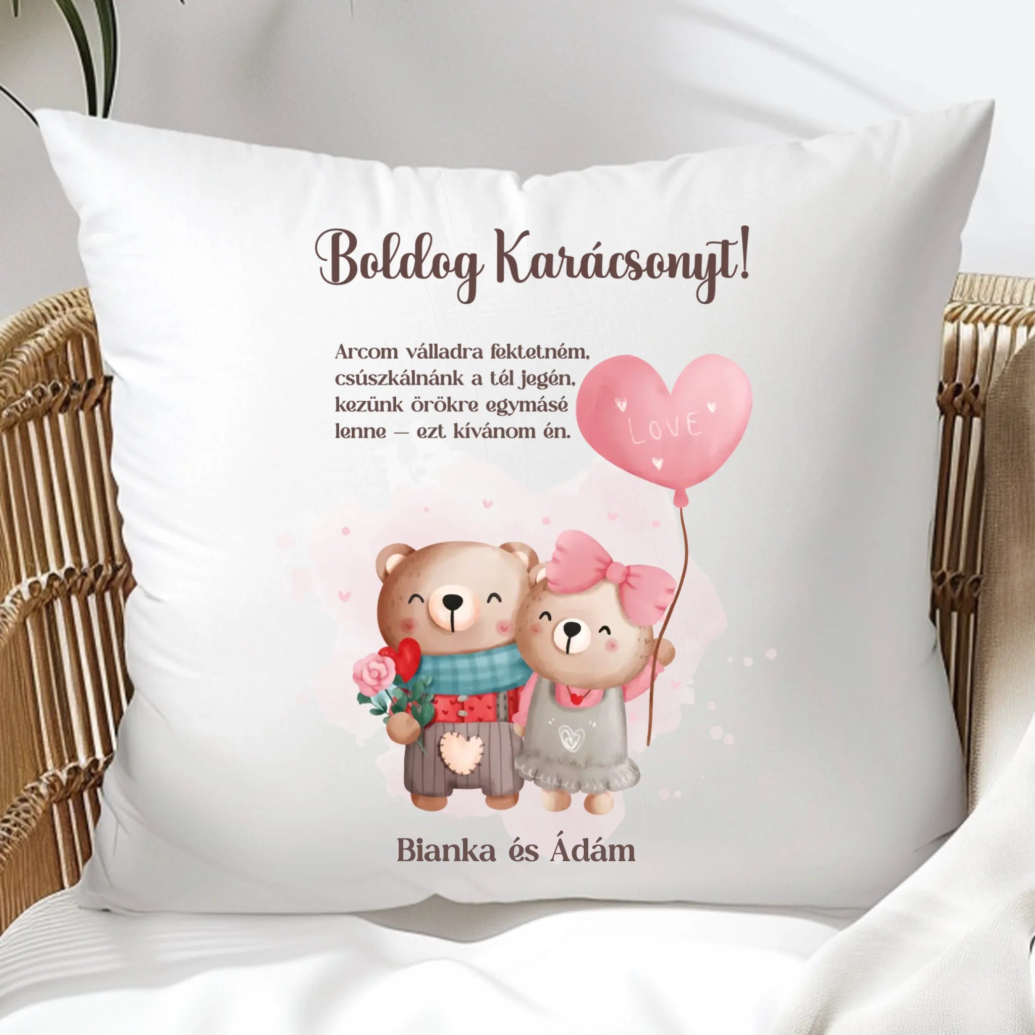 Szerelmes mackós párna a Ti neveitekkel és egy kedves idézettel. Szívhez szóló ajándék a párunknak, amelyhez bármikor hozzá tud bújni, amikor nem vagyunk vele.
