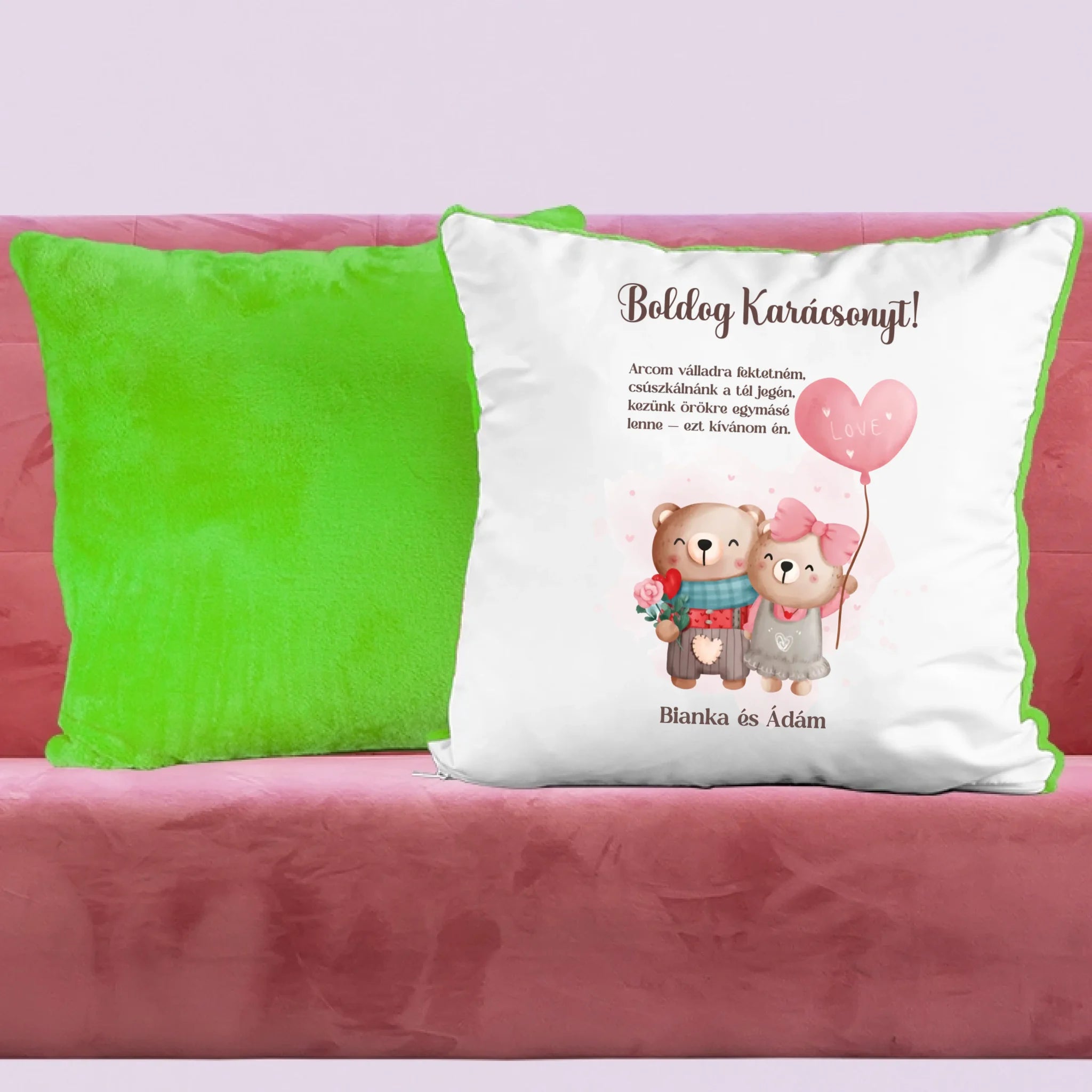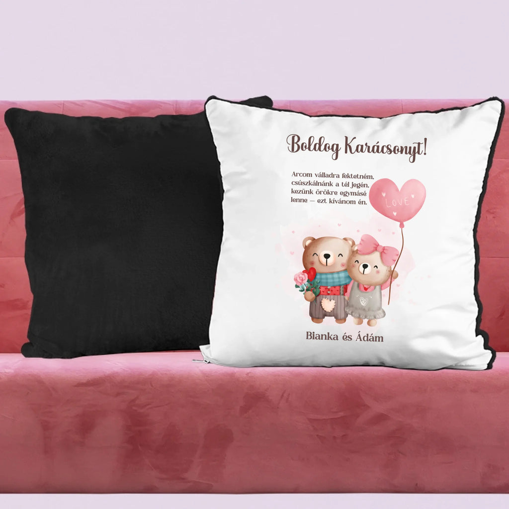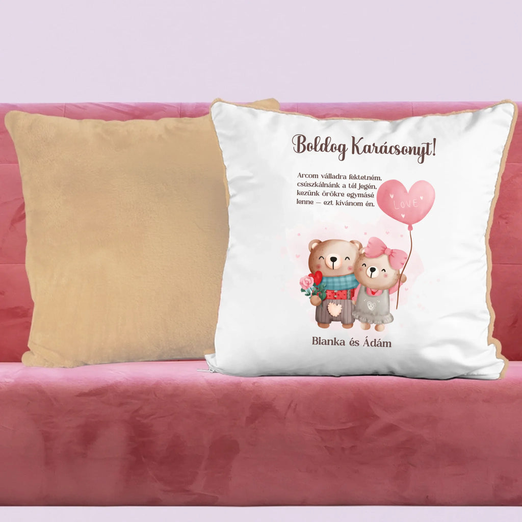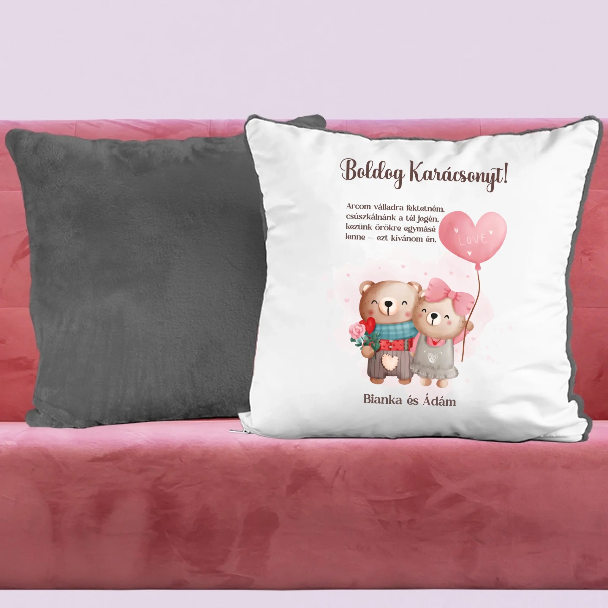 Szerelmes mackós párna a Ti neveitekkel és egy kedves idézettel. Szívhez szóló ajándék a párunknak, amelyhez bármikor hozzá tud bújni, amikor nem vagyunk vele.
