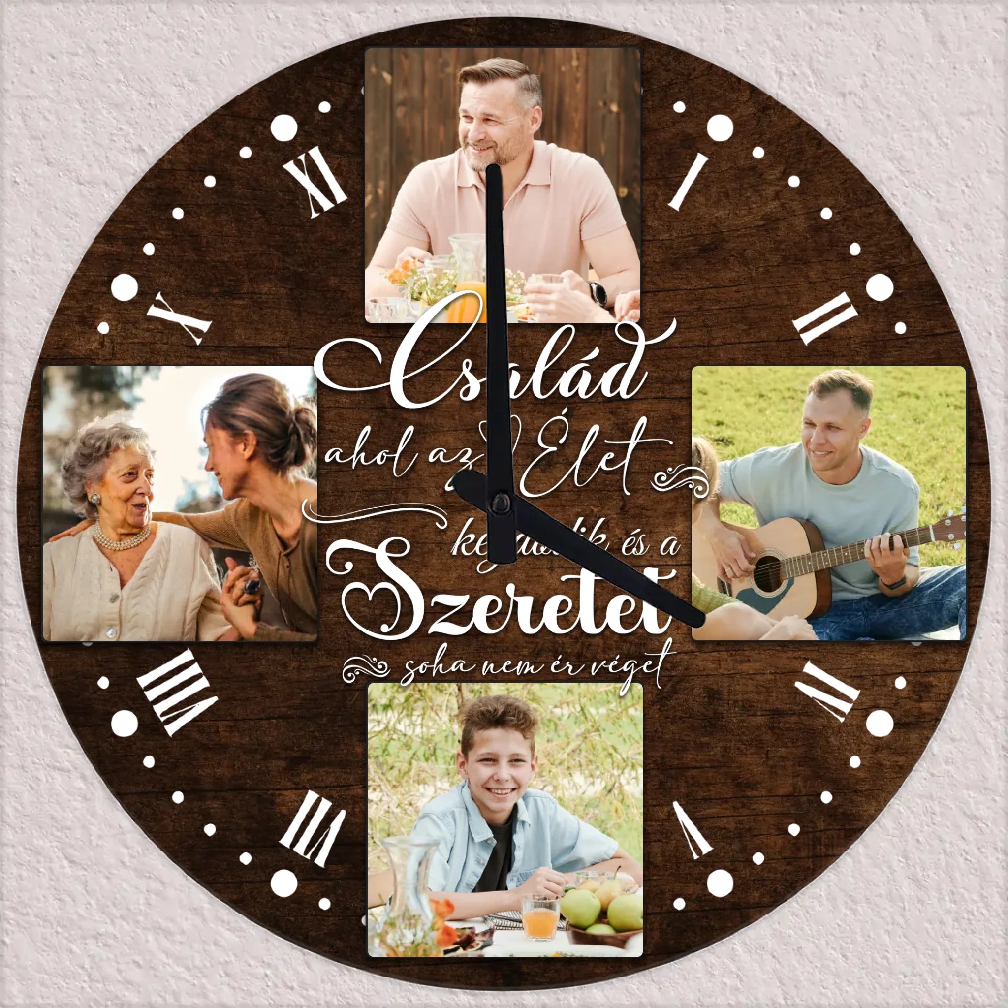 Egyedi 4 fényképes falióra a Család ahol az élet kezdődik és a Szeretet soha nem ér véget felirattal