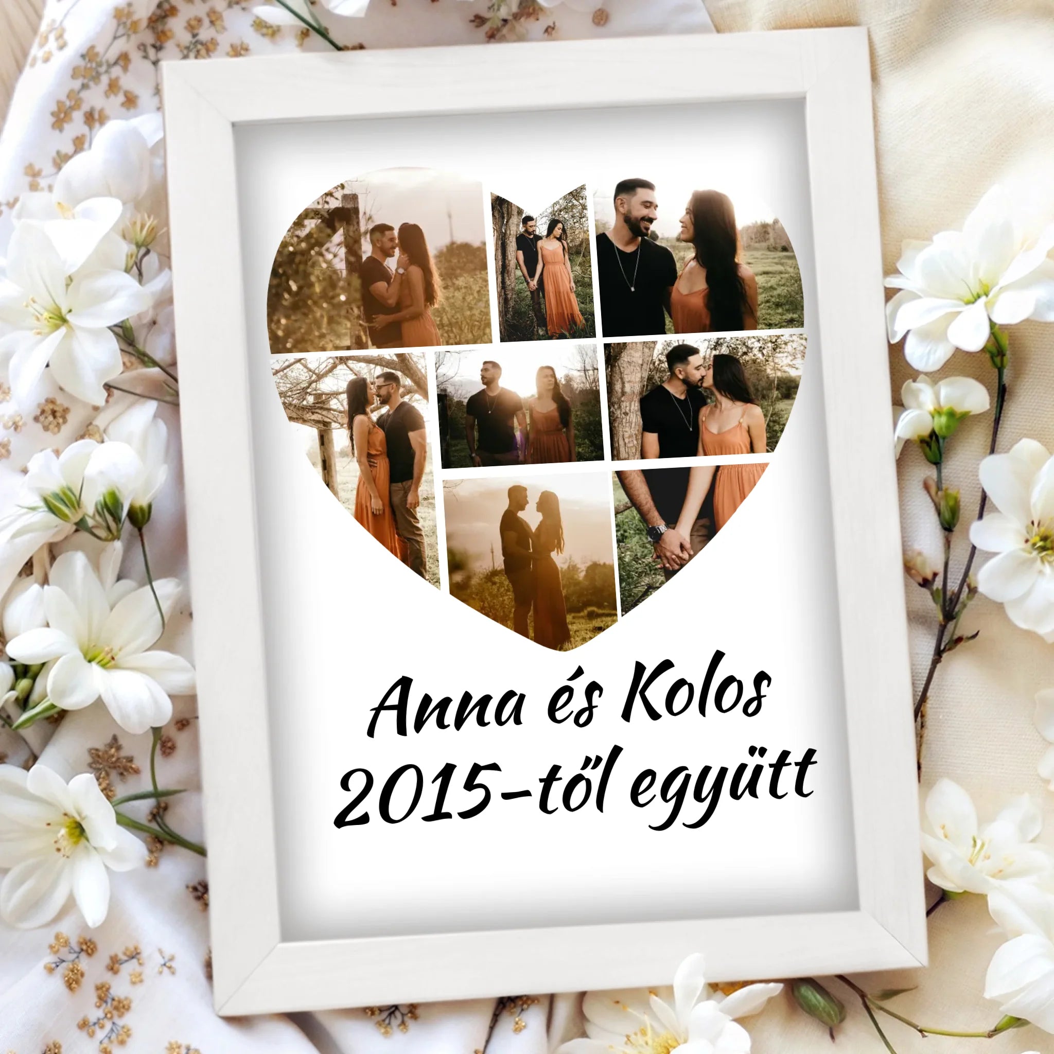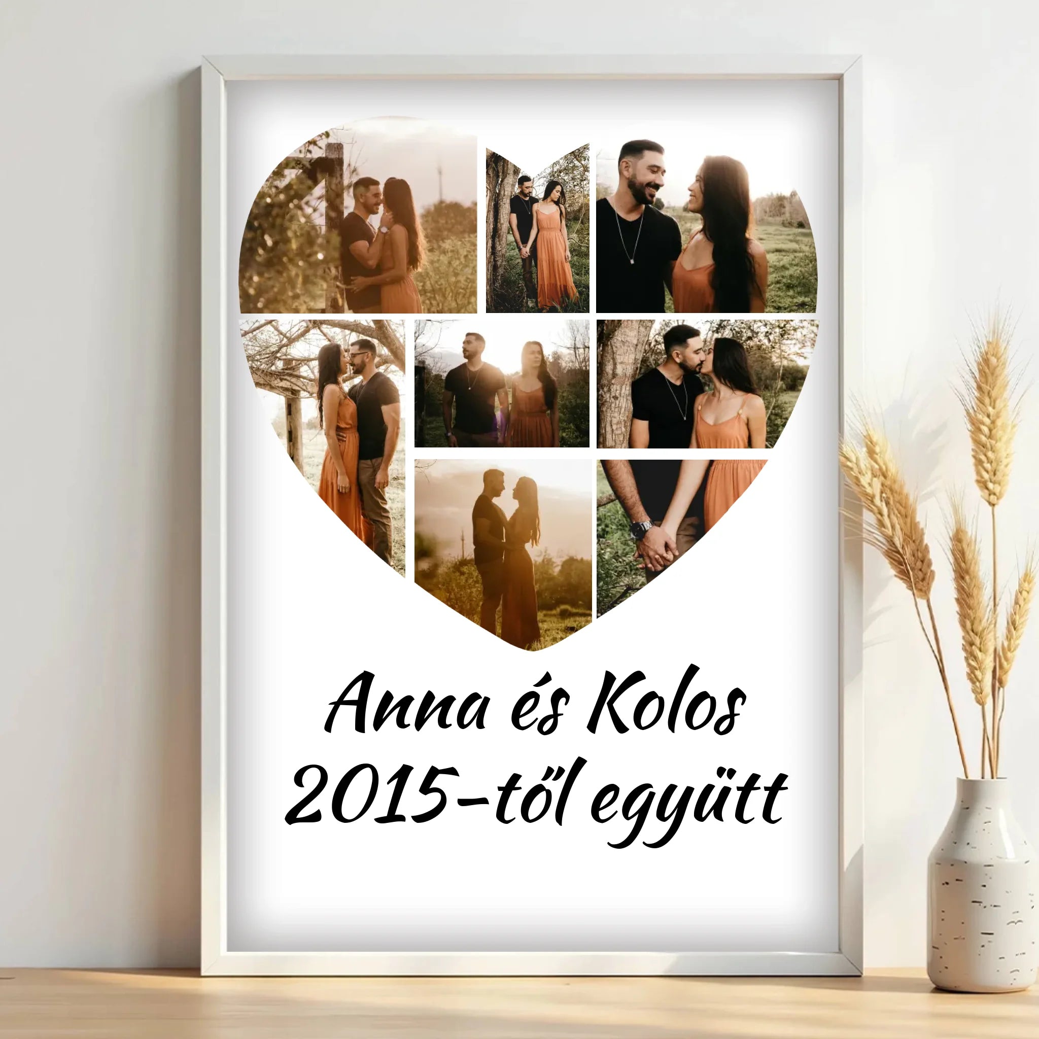 Egyedi falikép saját fényképeiddel szív alakú montázsba rendezve. Tervezd meg otthonod legszebb dekorációját faliképünkkel, amely szemet gyönyörködtetően kiemeli a szoba atmoszféráját.