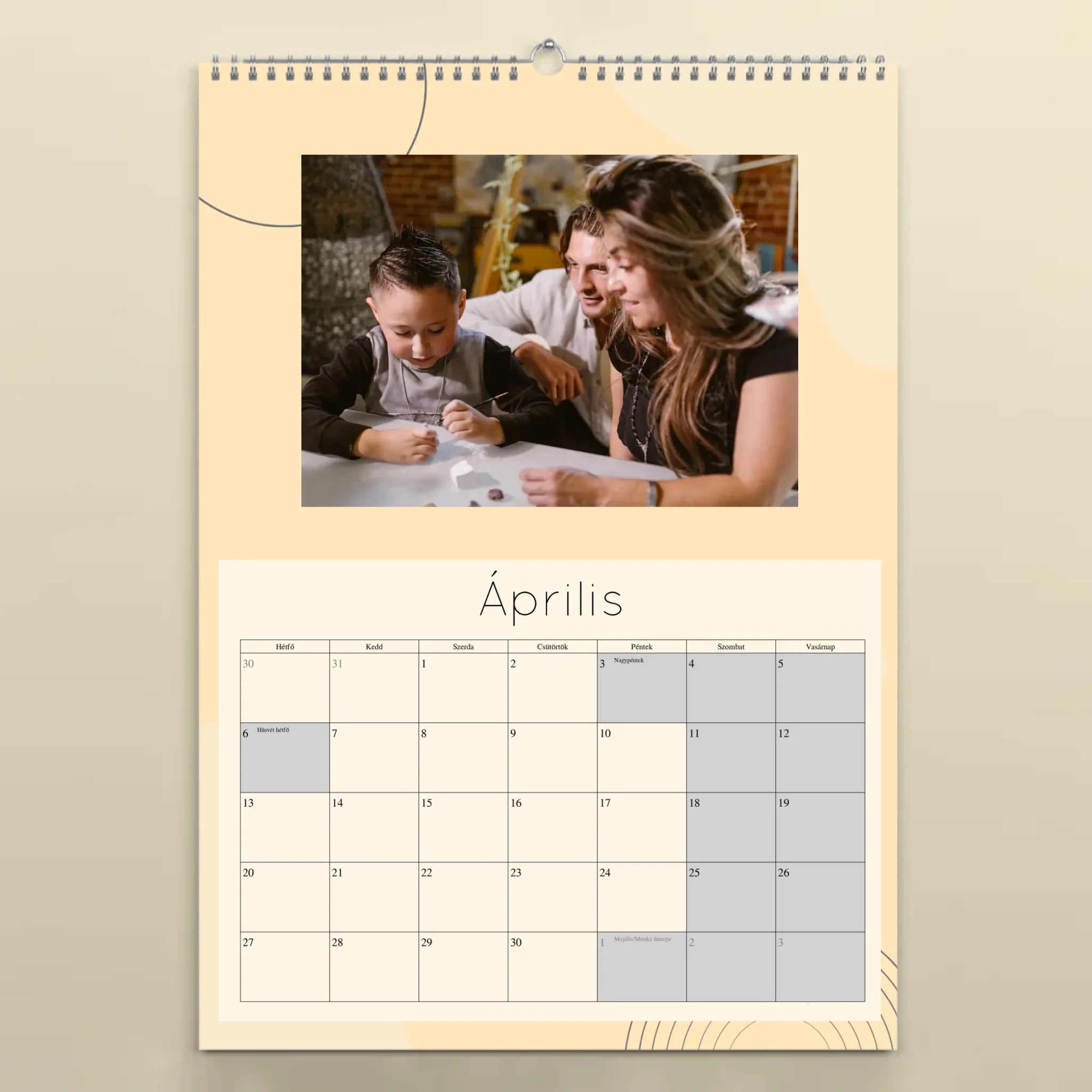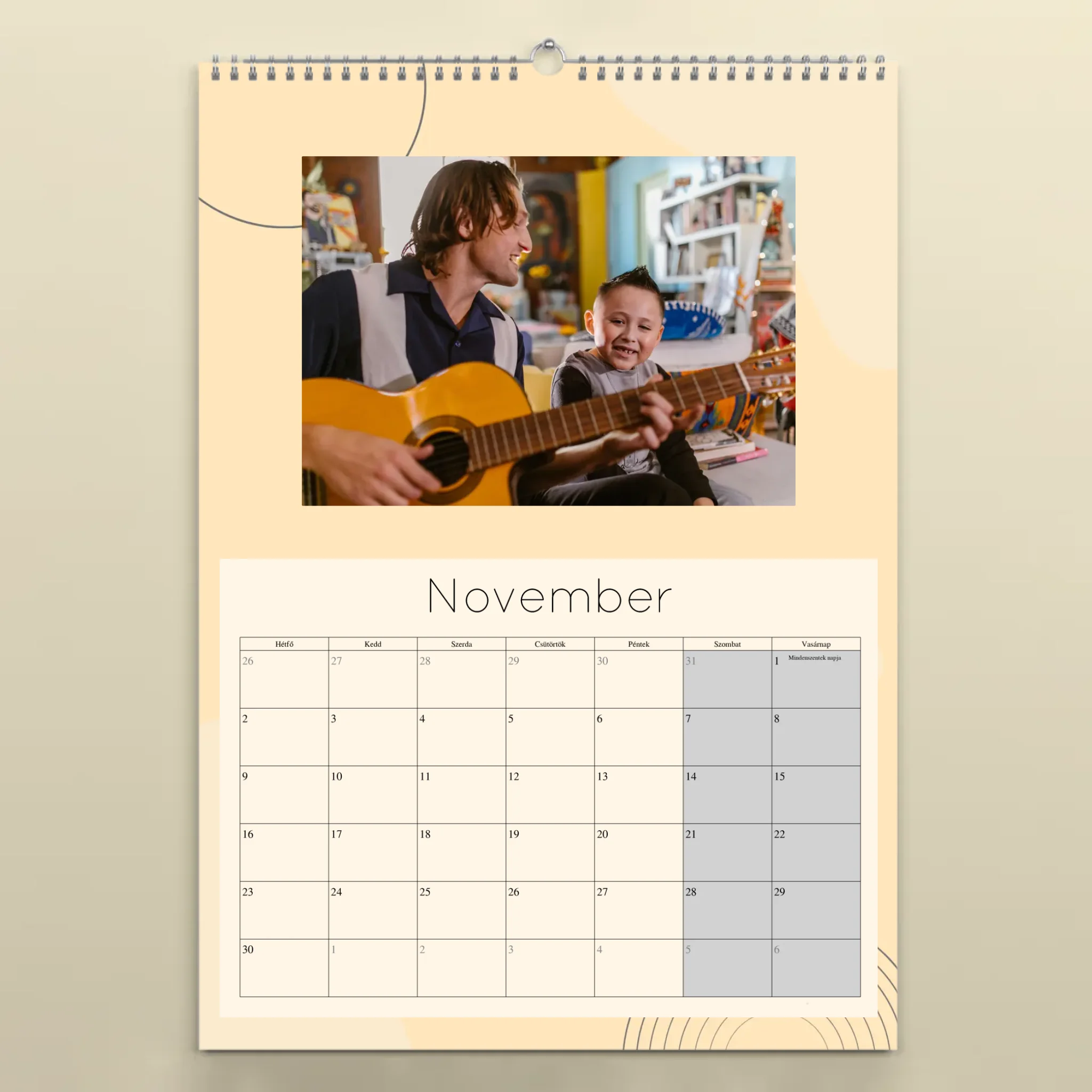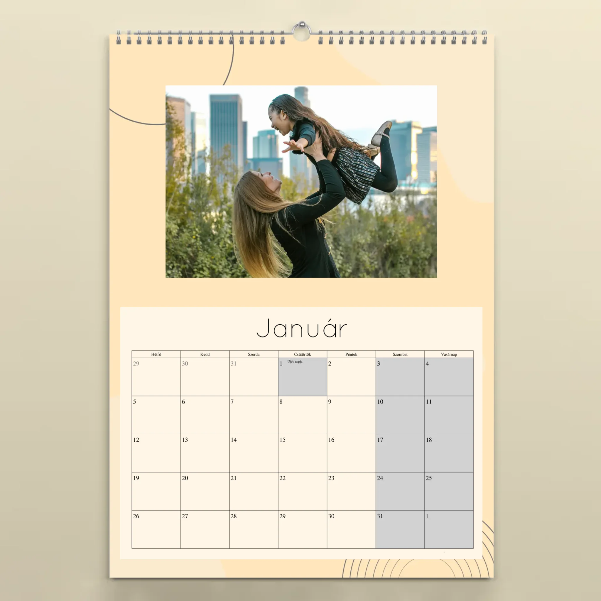 A naptárat könnyedén személyre szabhatod: töltsd fel 12 kedvenc fotódat, válaszd ki a kezdő hónapot, és mi gondoskodunk a prémium minőségű nyomtatásról. A falinaptár minden hónapja tartalmazza a magyar ünnepnapokat, így nemcsak szép, de praktikus kiegészítője is az otthonodnak.