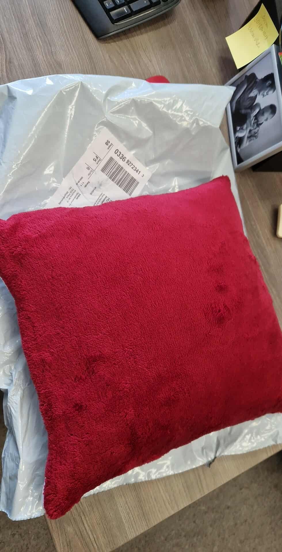 Nagyon szép a párna, csak a hátsó oldala inkább bordó, mint piros. A kép alapján szép, élénk pirosnak láttam.
