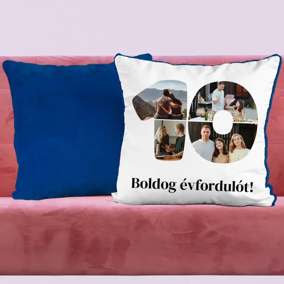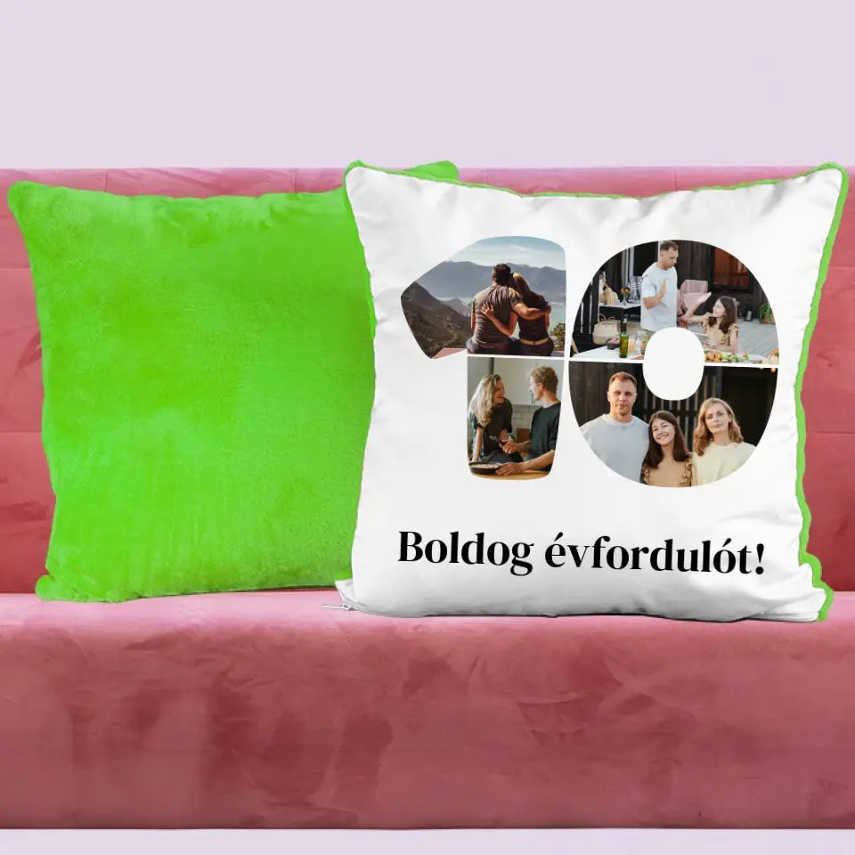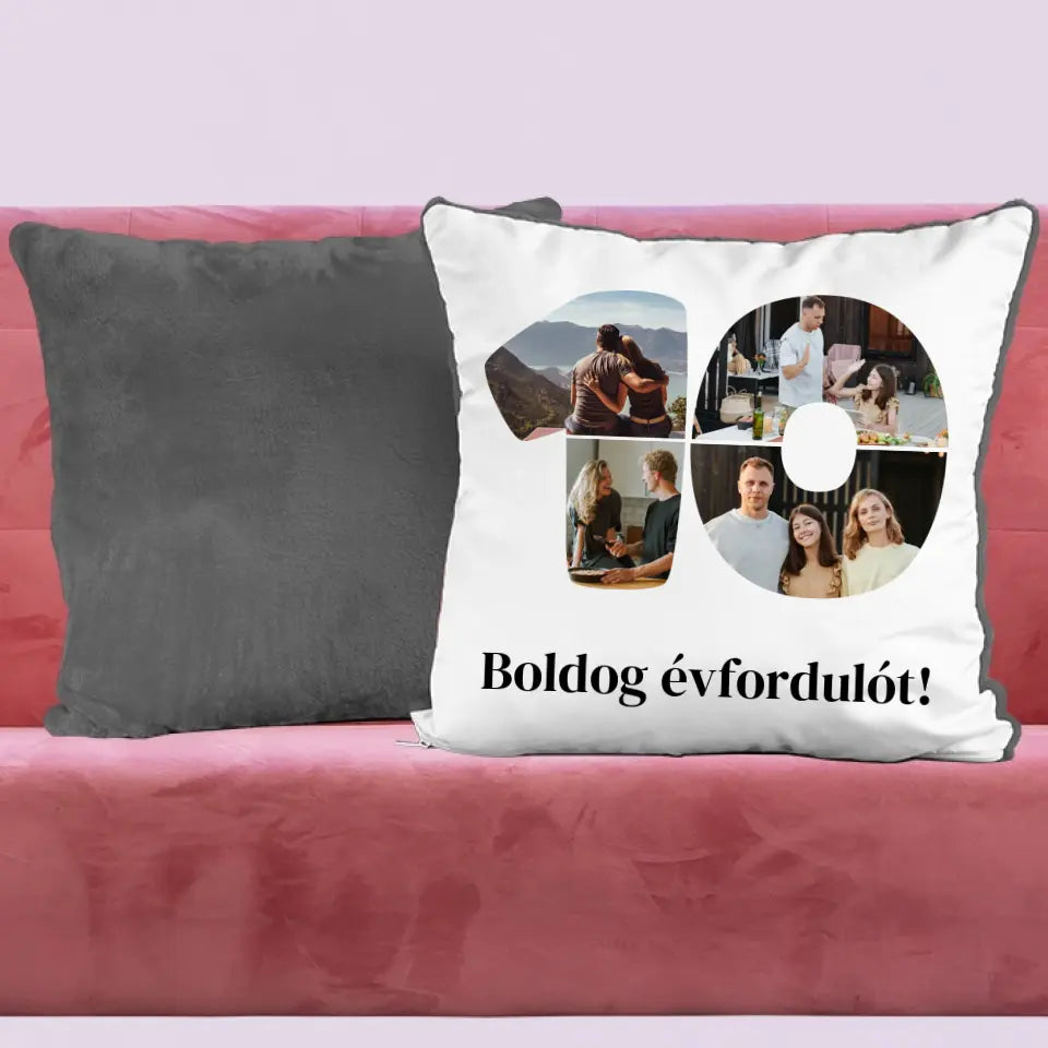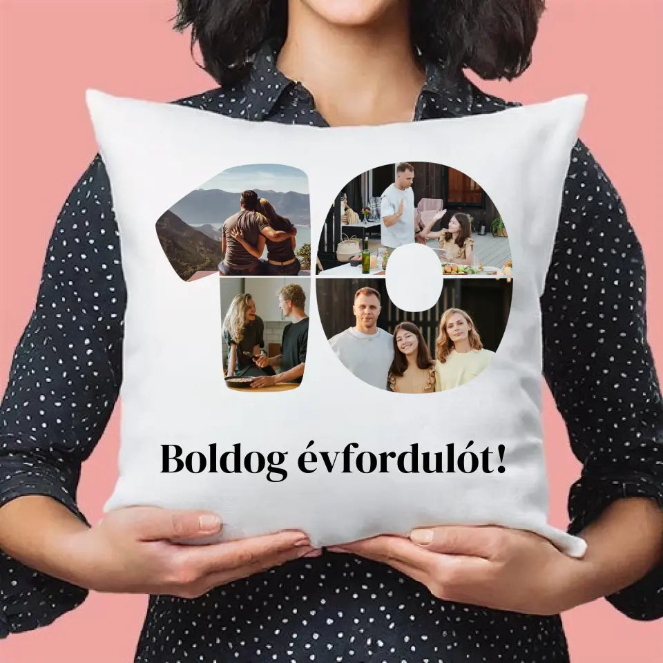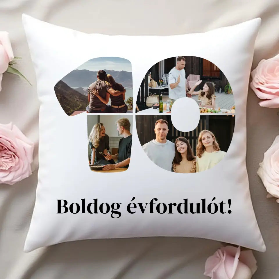 Egyedi fényképes párna szám alakú montázzsal, ami tökéletes ajándék születésnapra vagy évfordulóra is.