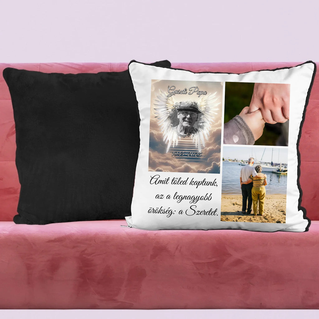 A három fotó elrendezése lehetővé teszi, hogy egy történetet mesélj el: múlt, jelen, örök emlék – mindezt egyetlen párnán. Az angyalminta finom, vigasztaló szimbólumként őrzi a szeretetet és a megmaradó köteléket.
